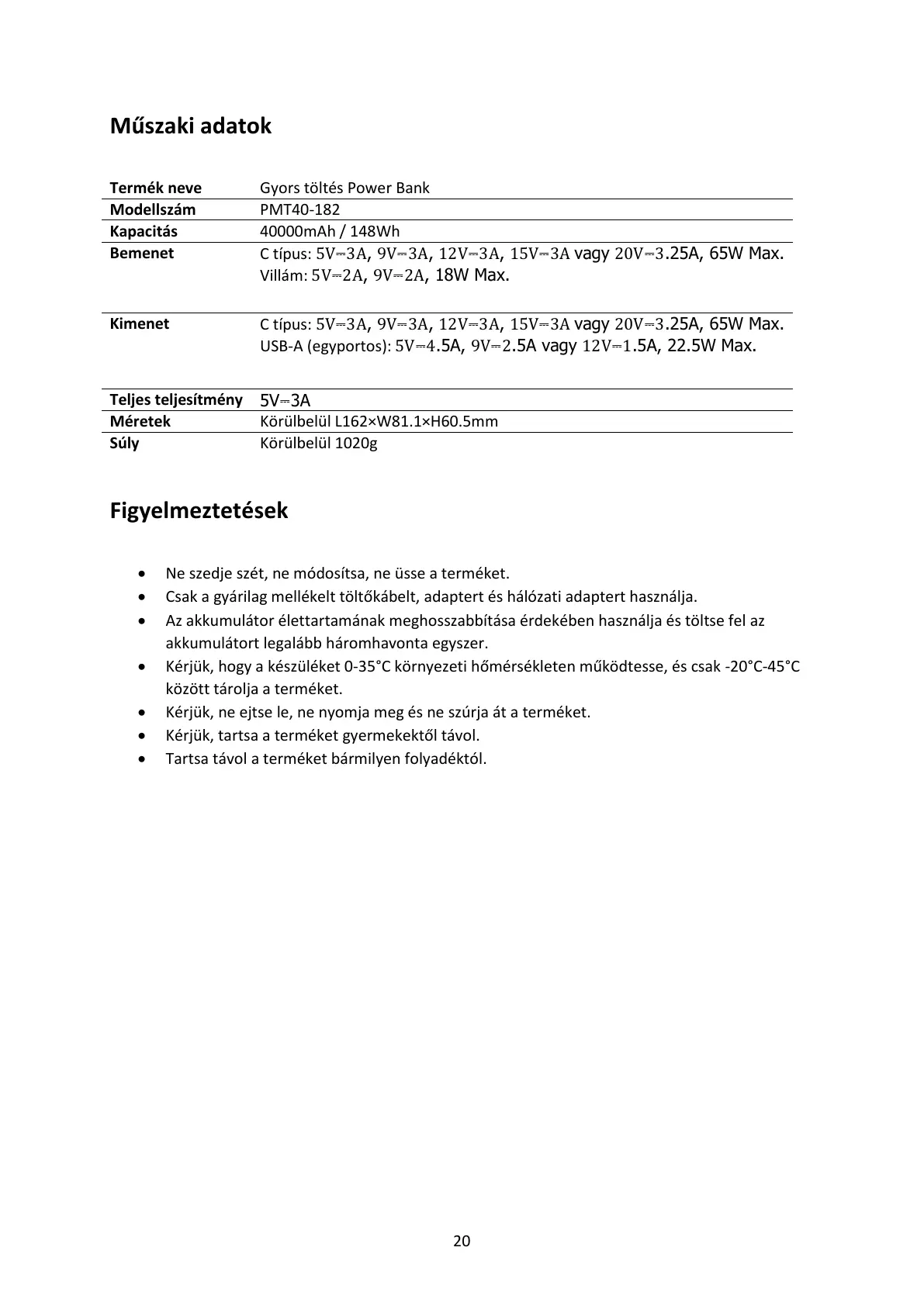 USB-A (egyportos): 5V⎓4.5A, 9V⎓2.5A vagy 12V⎓1.5A, 22.5W Max.