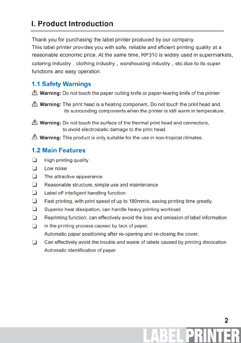 Rongta Technology RP310 - Product Introduction; Safety Warnings; Main Features