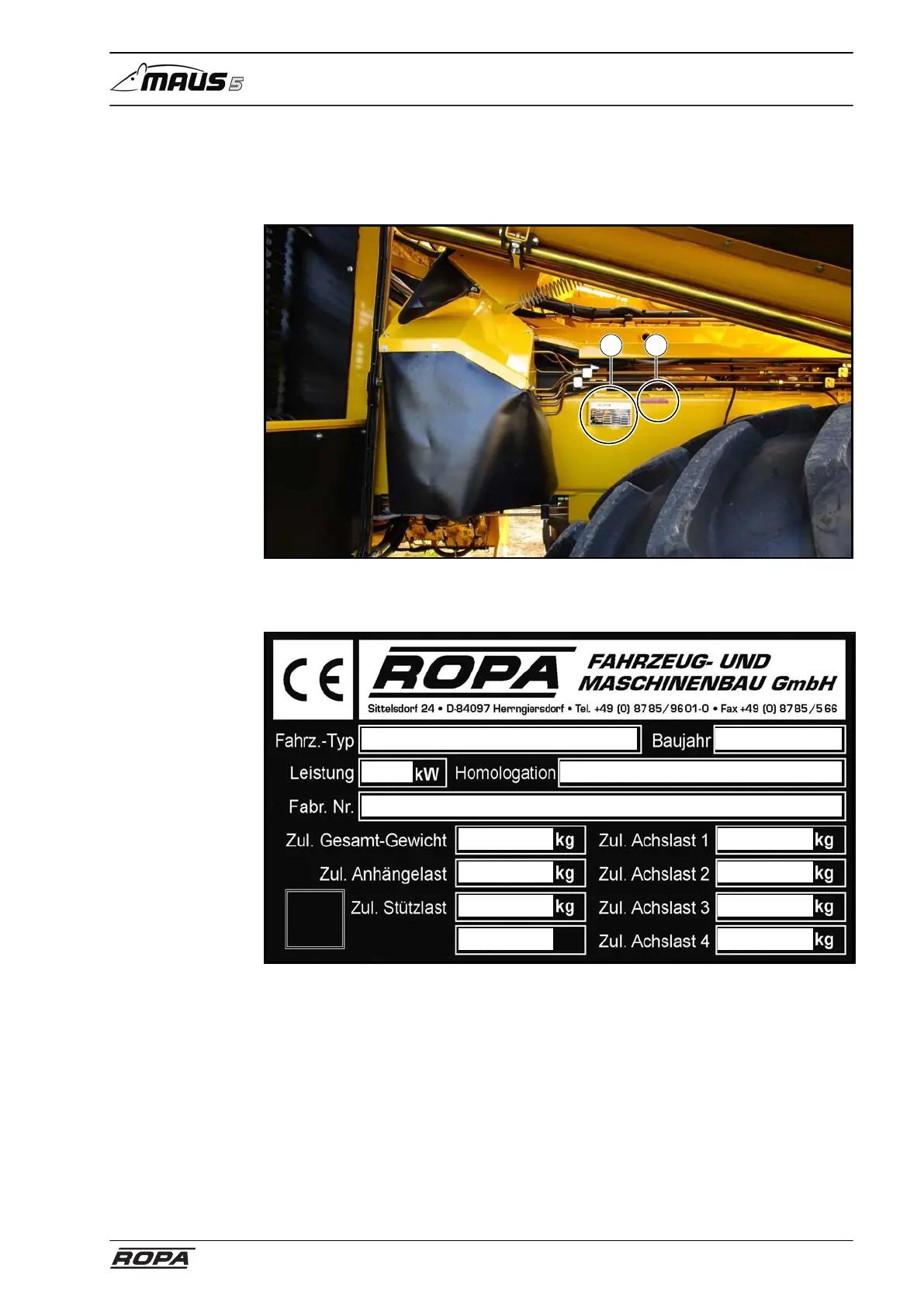 The name plate (2) of the machine is located on the right side of the vehicle, on the