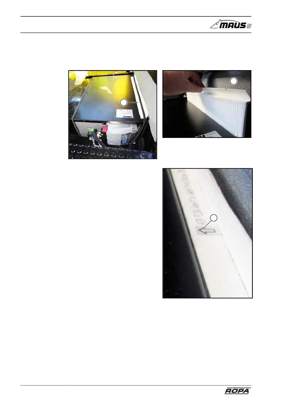 The fresh air intake filter (1) for the driver's cabin is located right, outside on the rear