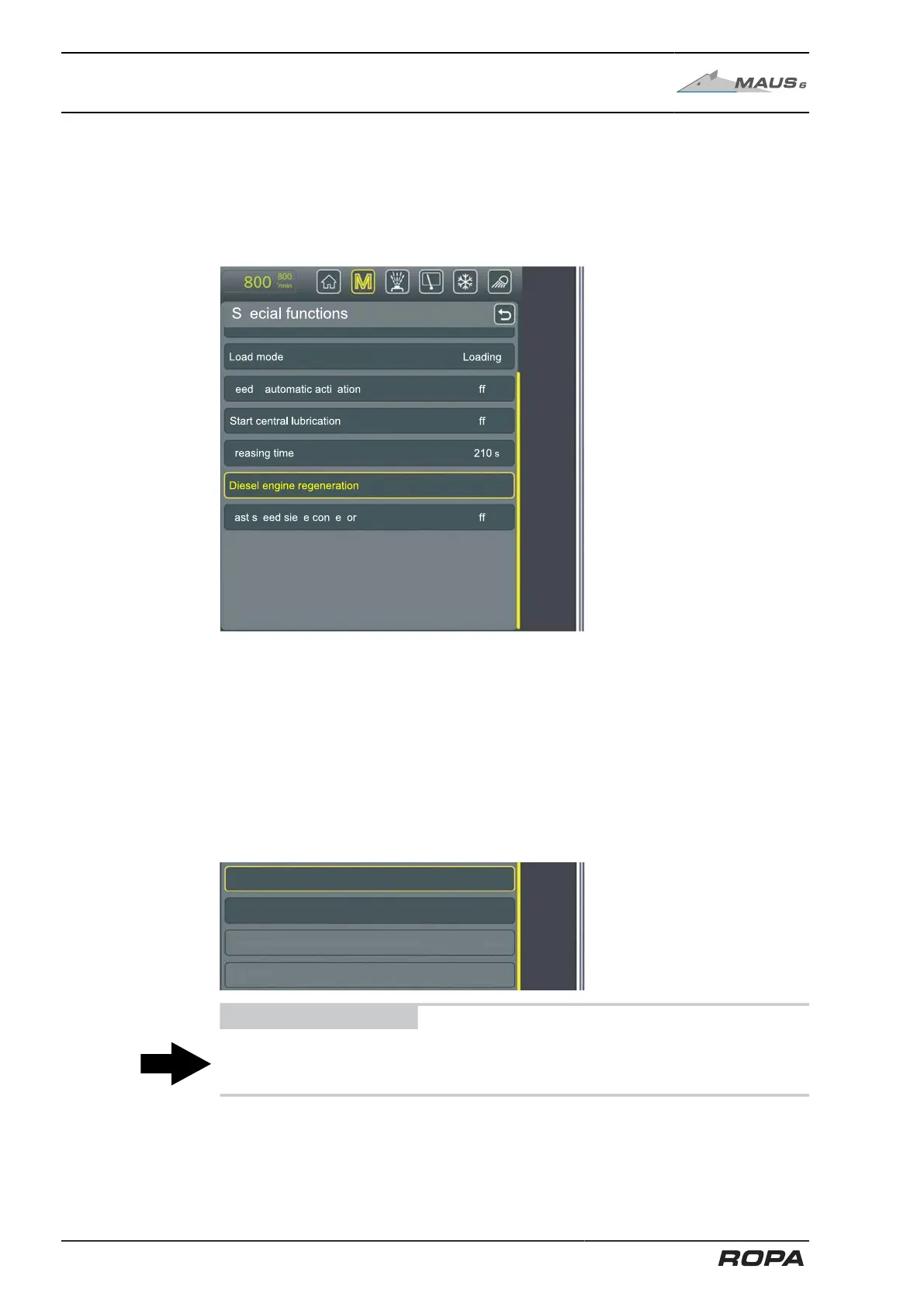 To start DPF regeneration (High Idle Regeneration) open the main menu, "Special