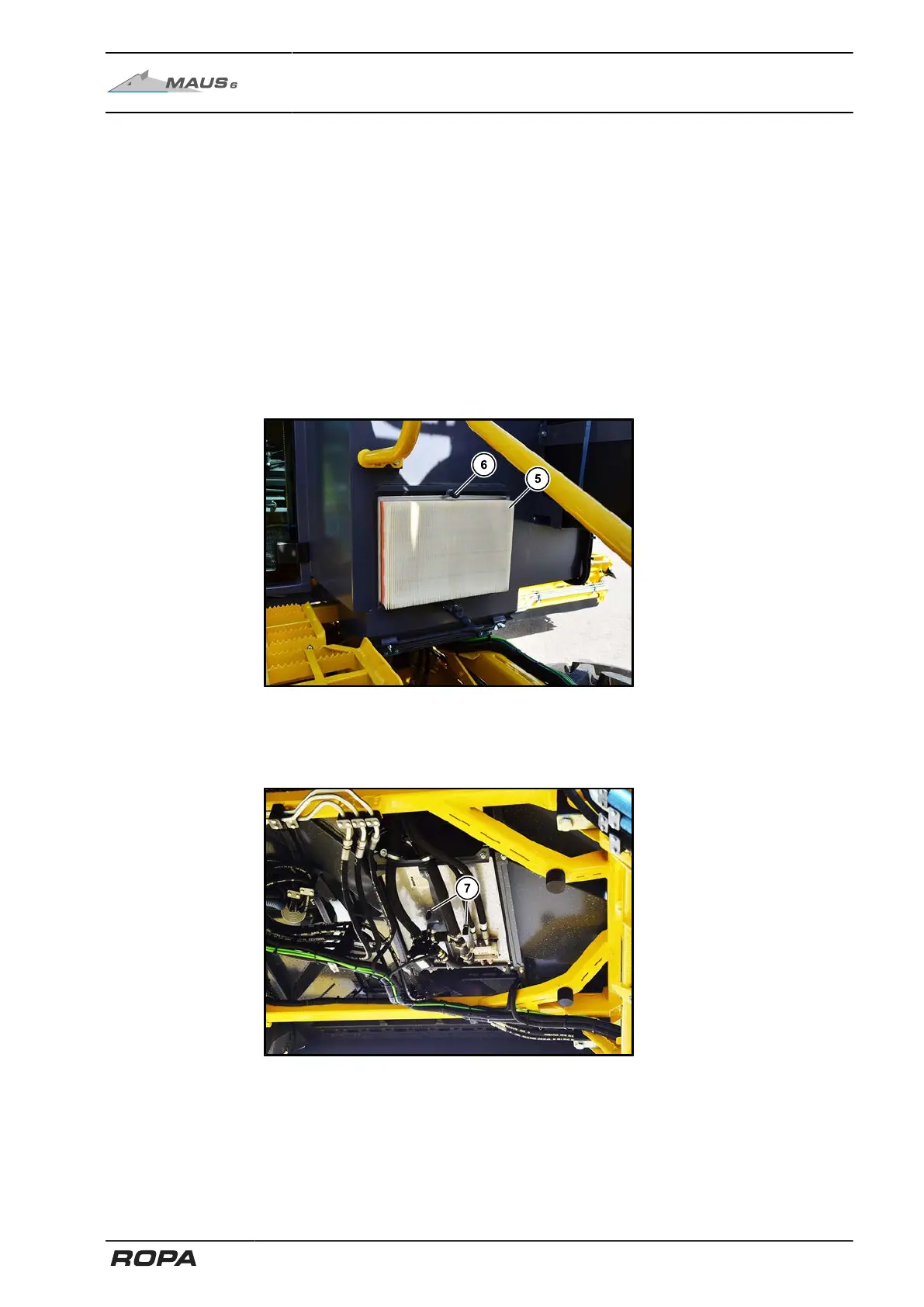 The fresh air intake filter (5) for the driver's cabin is located right, outside on the rear