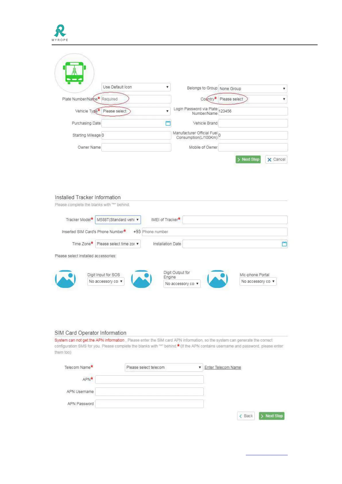 4.6 Click Next Step to fill in sim card APN information. Please select the telecom name, if the telecom is not