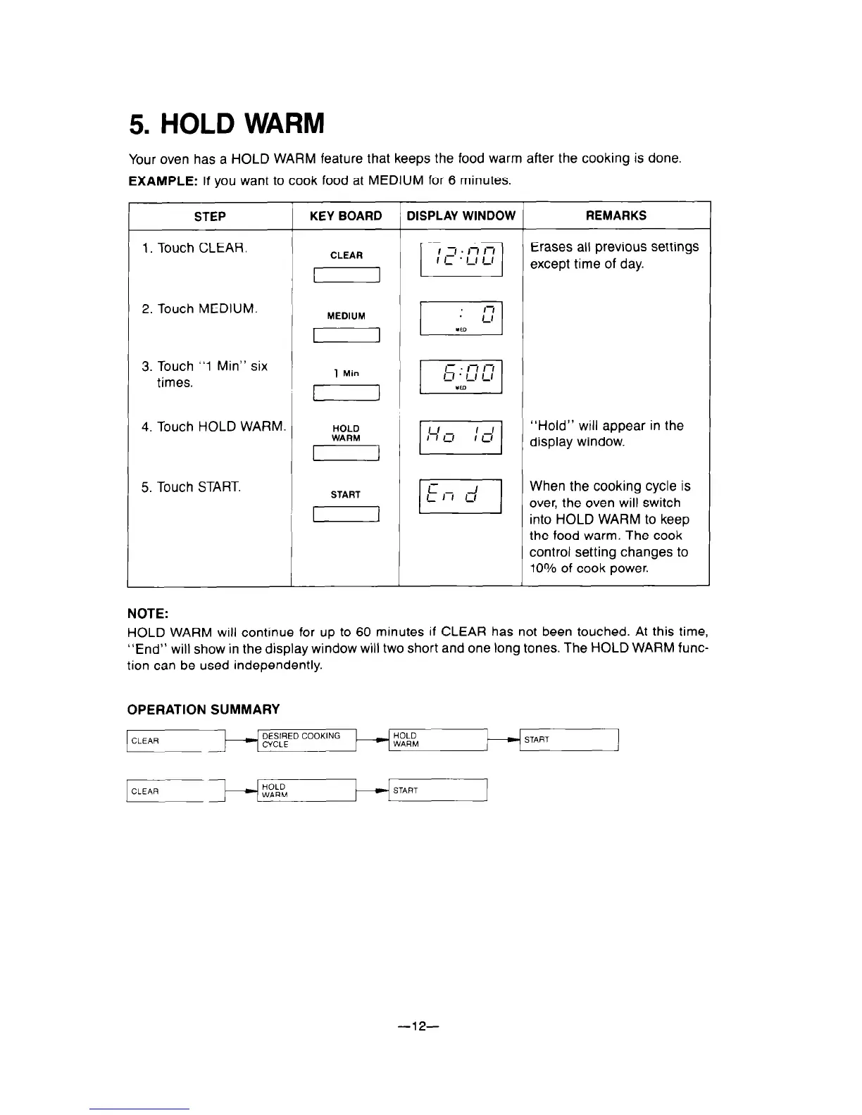 “End” will show in the display window will two short and one tong tones. The HOLD WARM func-