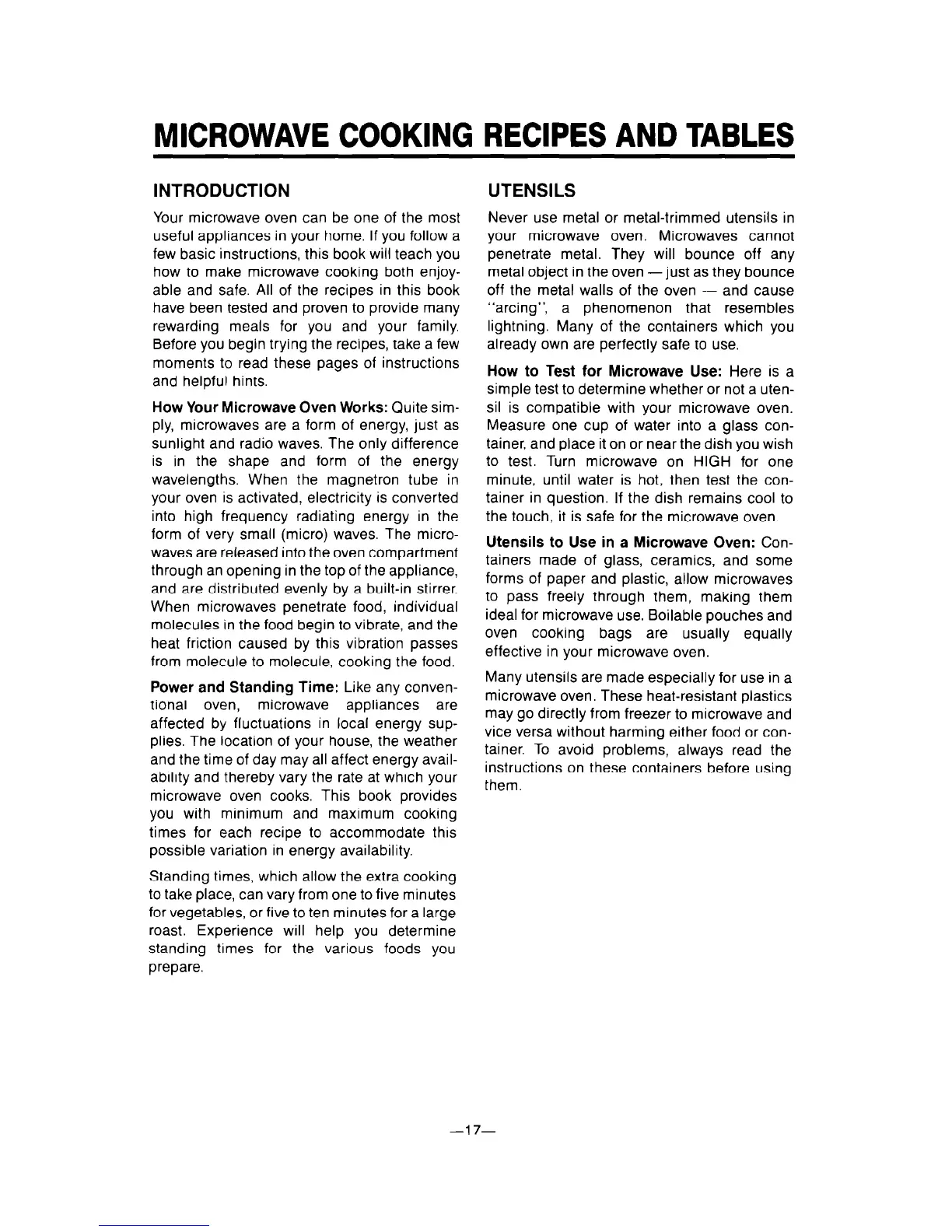 MICROWAVE COOKING RECIPES AND TABLES