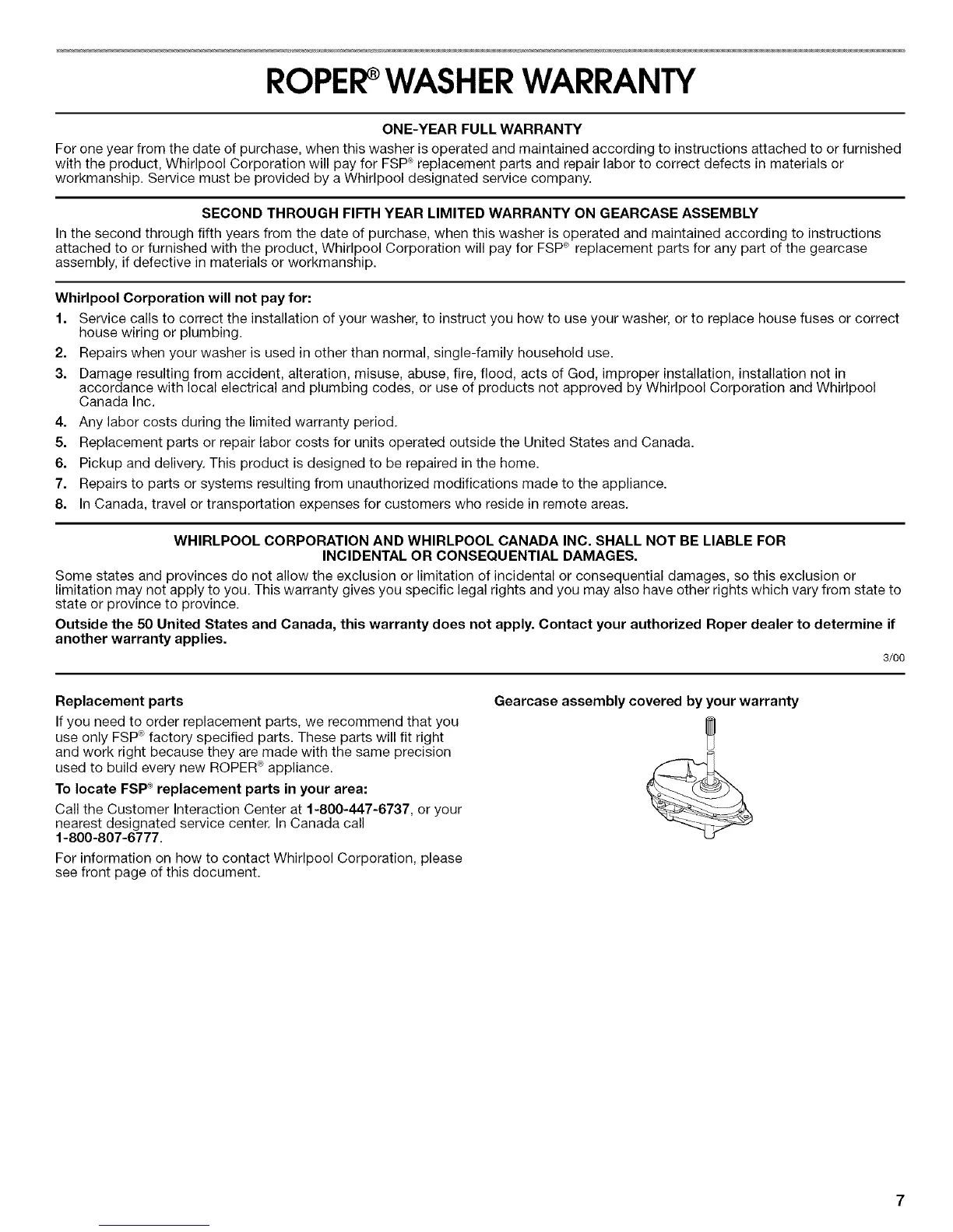 attached to or furnished with the product, Whirlpool Corporation will pay for FSP ° replacement parts for any part of the gearcase