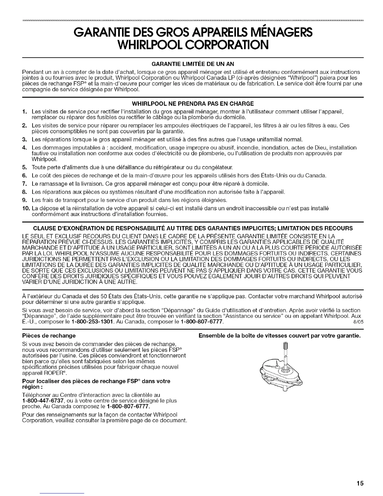 /_,I'exterieur du Canada et des 50 €tats des 12tats-Unis, cette garantie ne s'applique pas. Contacter votre marchand Whirlpool autorise