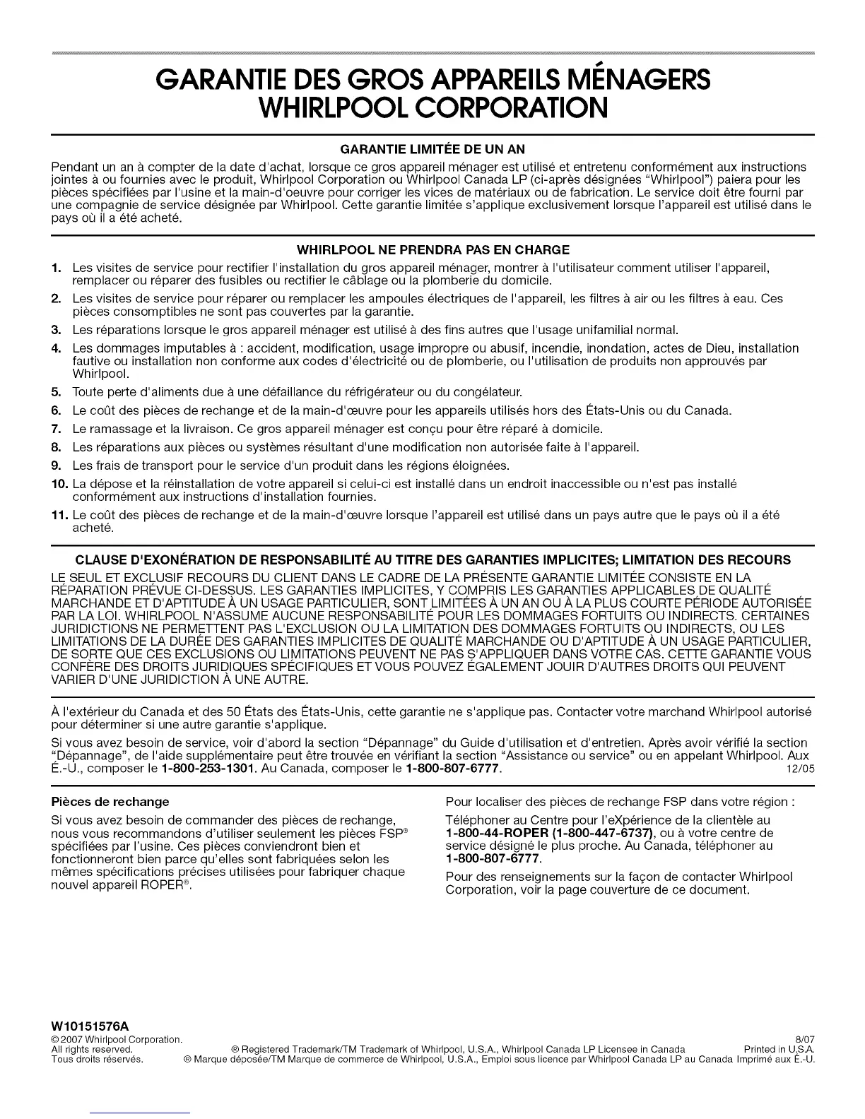A I'exterieur du Canada et des 50 12tats des 12tats-Unis, cette garantie ne s'applique pas. Contacter votre marchand Whirlpool autorise