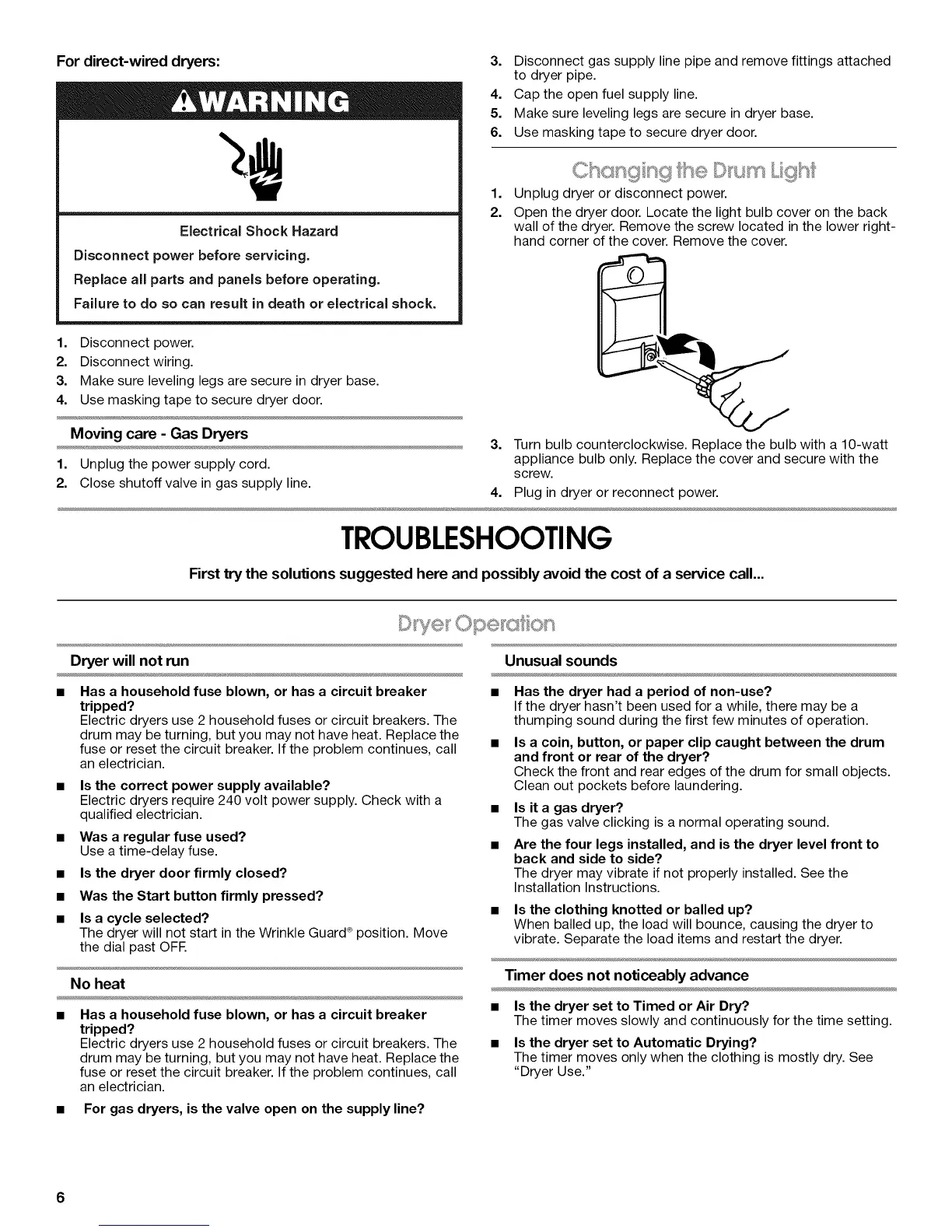 Roper RED4440VQ1 - Troubleshooting; Dryer Will Not Run; No Heat Issues; Unusual Dryer Sounds