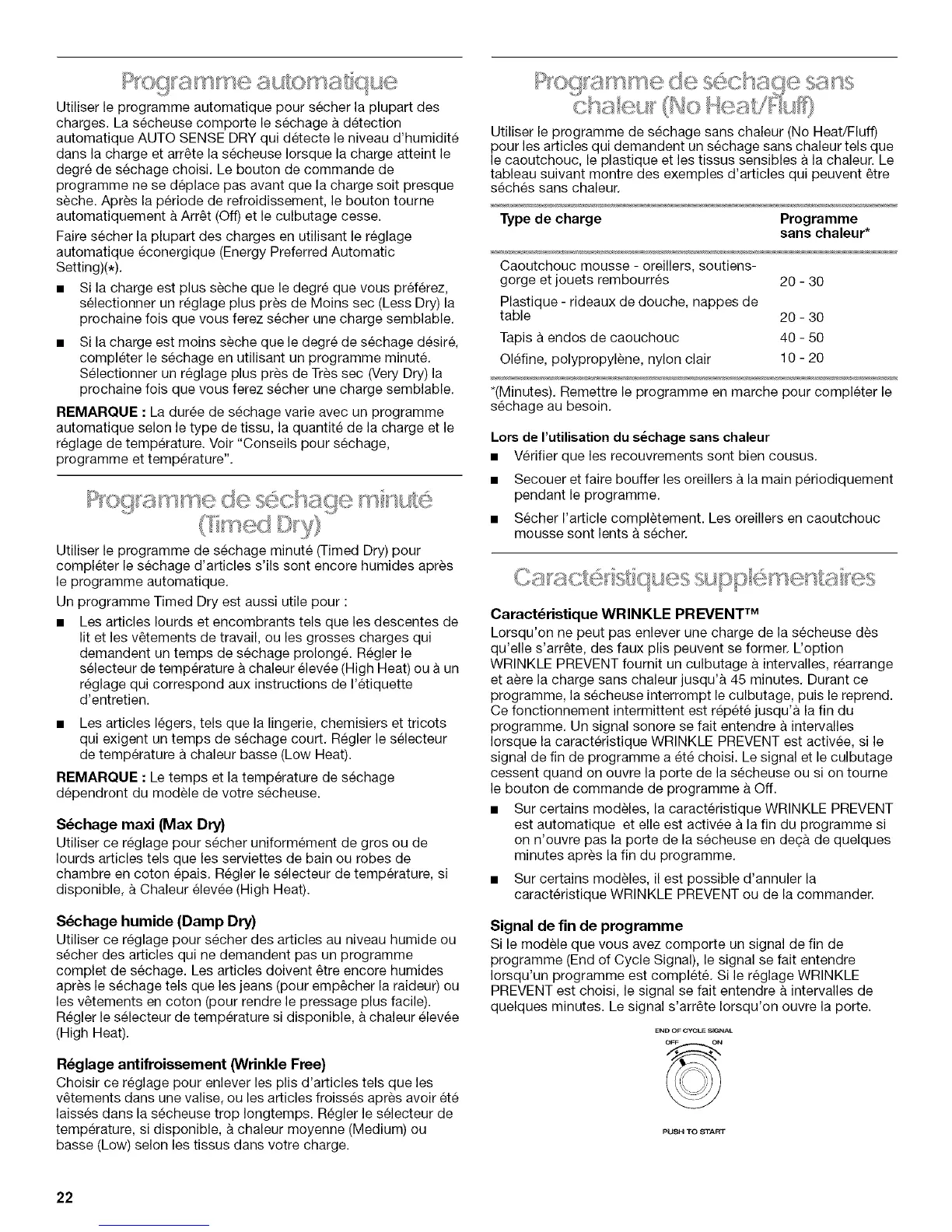 REMARQUE : La duree de sechage varie avec un programme