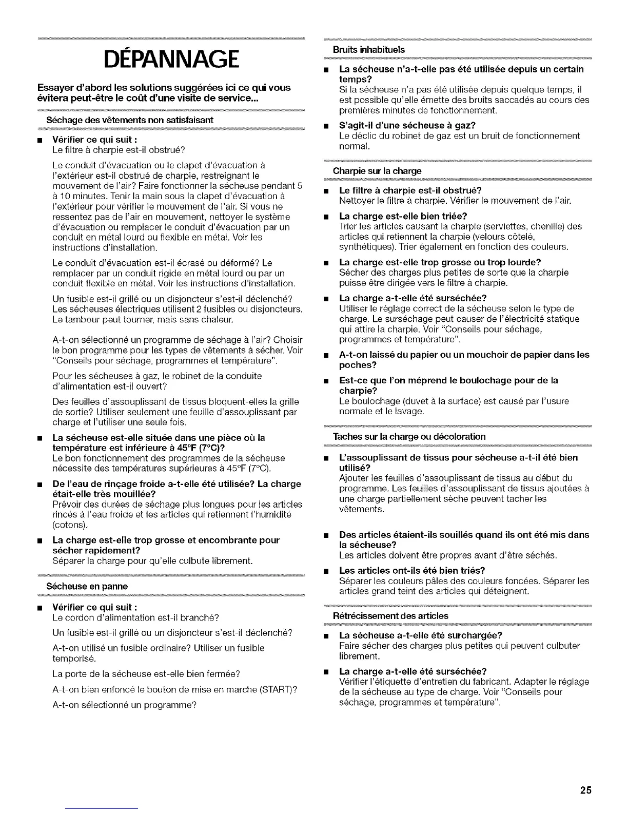 mouvement de I'air? Faire fonctionner la secheuse pendant 5