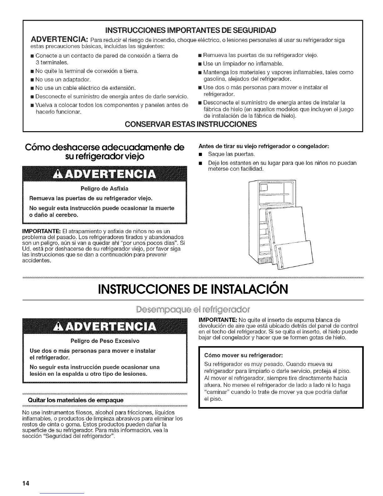 ADVERTENCIA: Para reducir el riesgo de incendio, choque electrico, o lesiones personales al usar su refrigerador siga