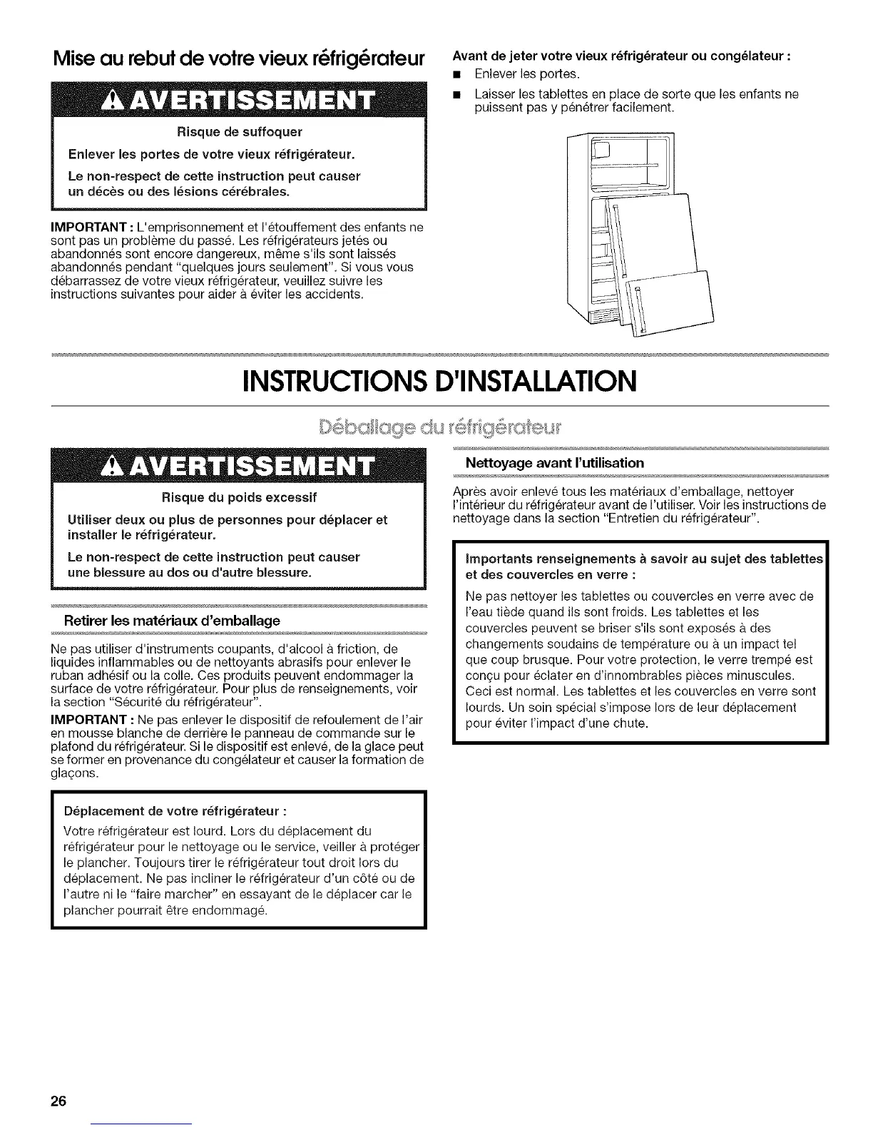 deplacement. Ne pas incliner le refrigerateur d'un c6te ou de