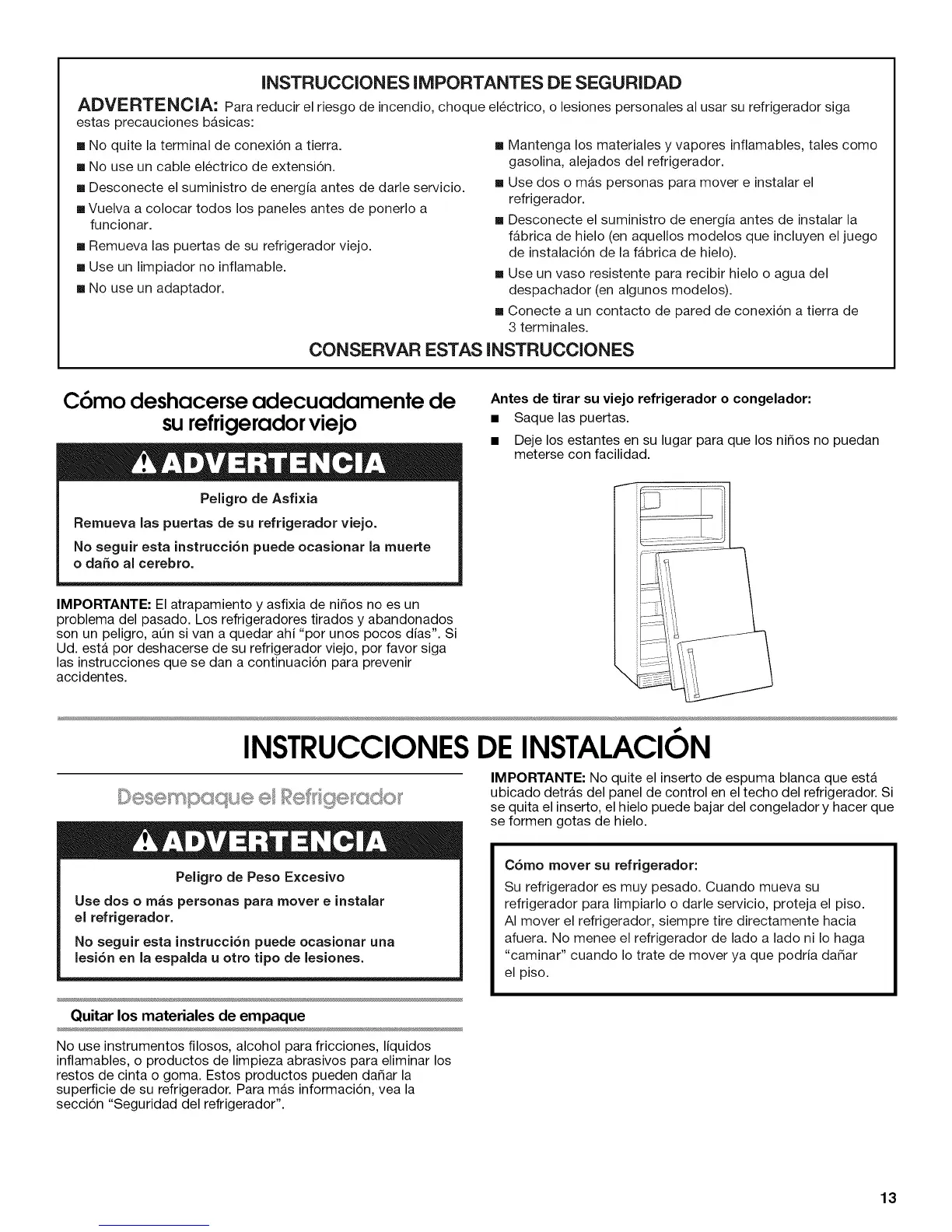 ADVERTENCIA: Para reducir el riesgo de incendio, choque electrico, o lesiones personales al usar su refrigerador siga