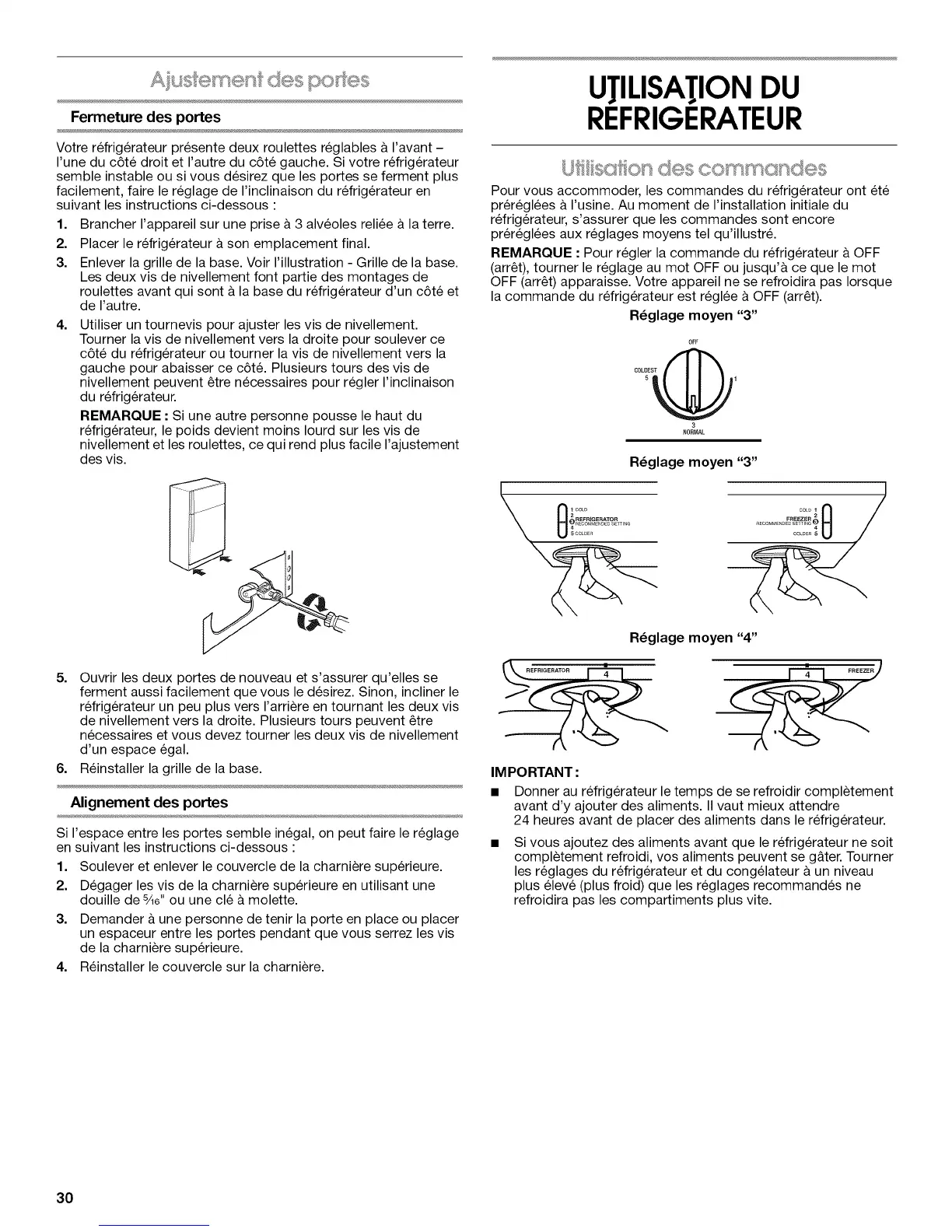 c6te du refrig6rateur ou tourner la vis de nivellement vers la