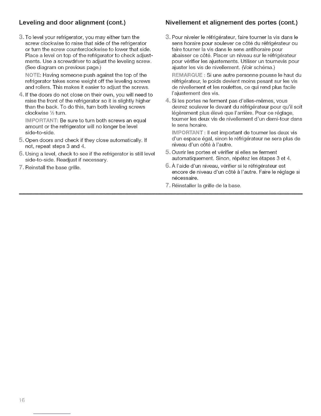 Leveling and door alignment (cont.) Nivellement et alignement des portes (cont.)