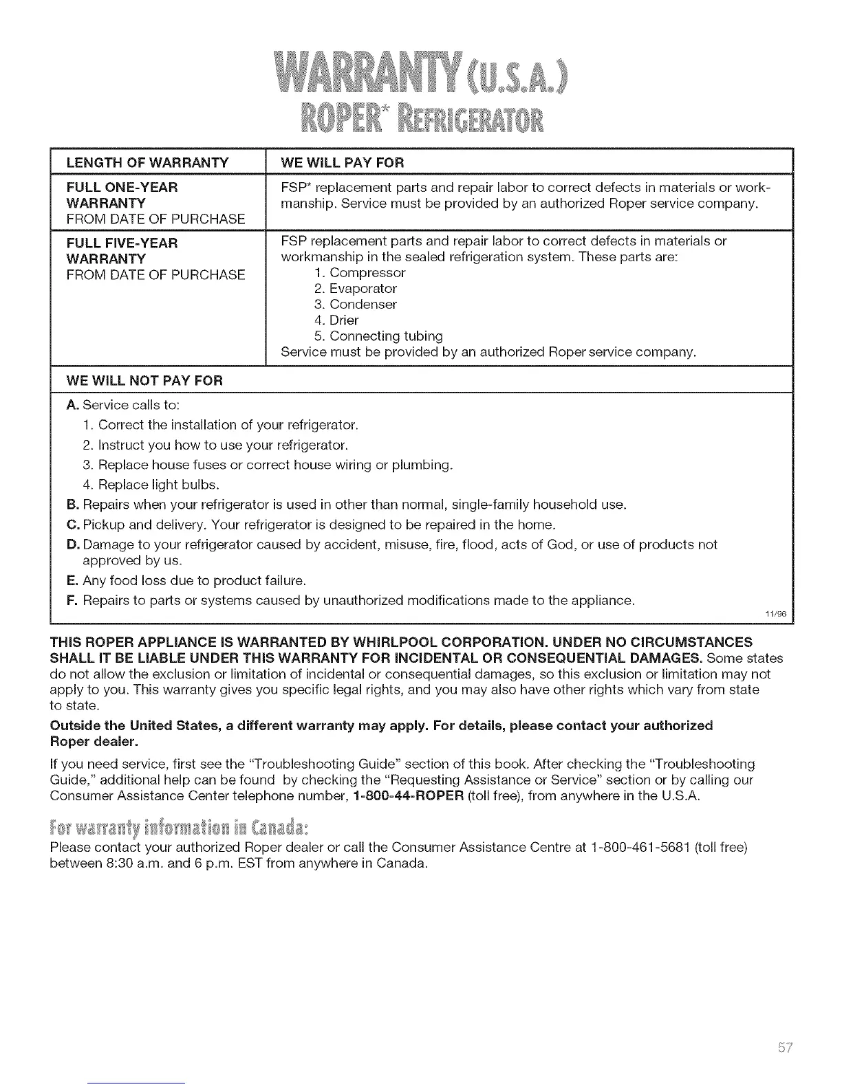 Please contact your authorized Roper dealer or call the Consumer Assistance Centre at 1-800-461-5681 (toll free)