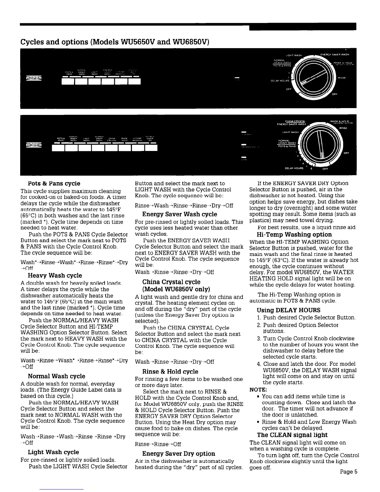 Cycles and options (Models WU565OV and WU685OV)