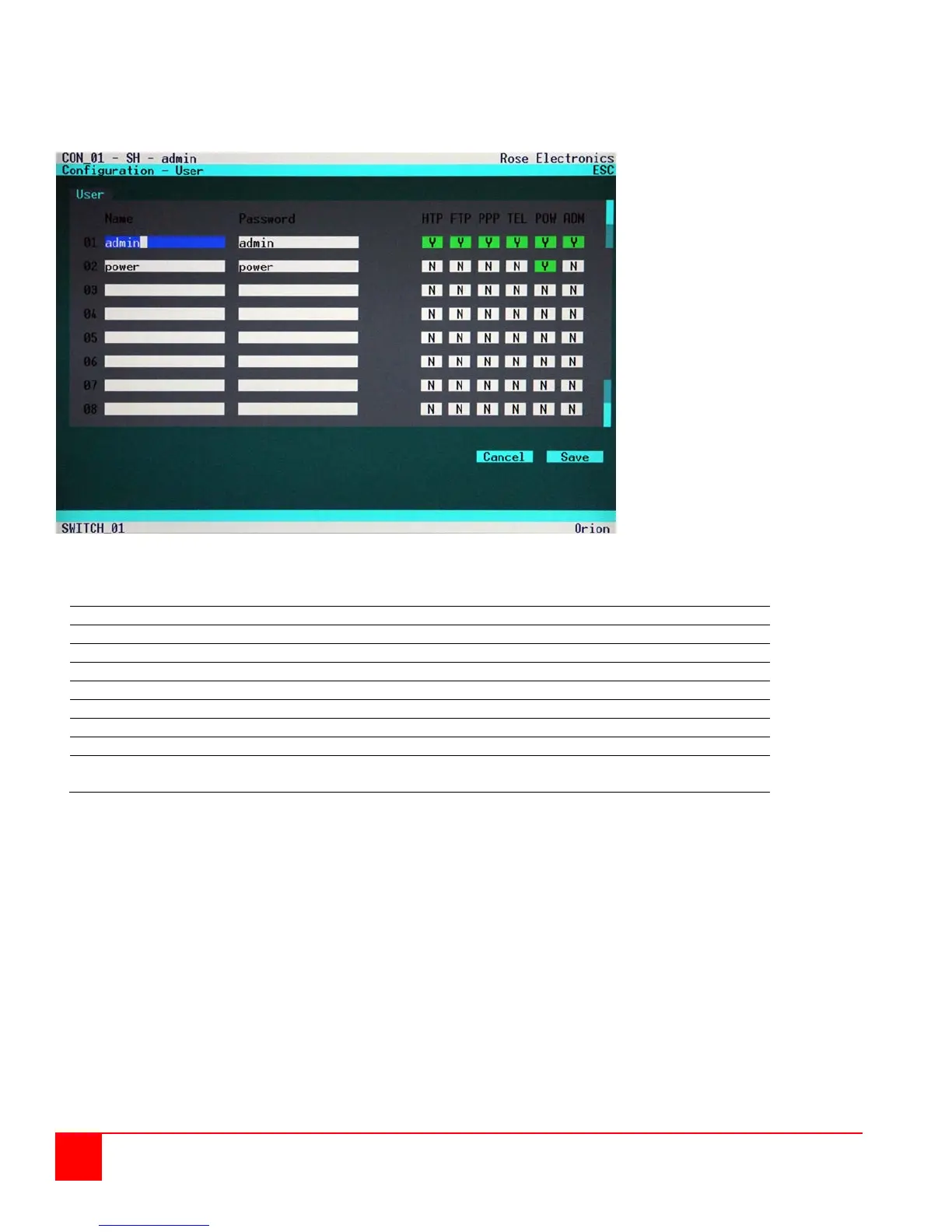 To configure the users of the Orion switch, select the option “User” in the “Configuration” menu by using the cursor