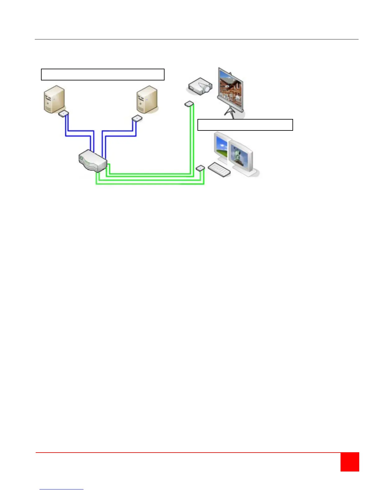 Connect each dual-head computer to a dual-head transmitter (Video 1, keyboard, mouse, video 2).