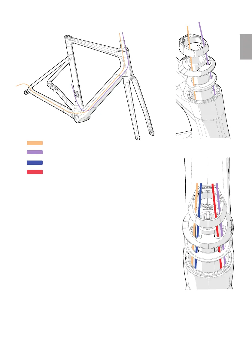 and laid in the frame. The front derailleur cable must be routed through the headset on