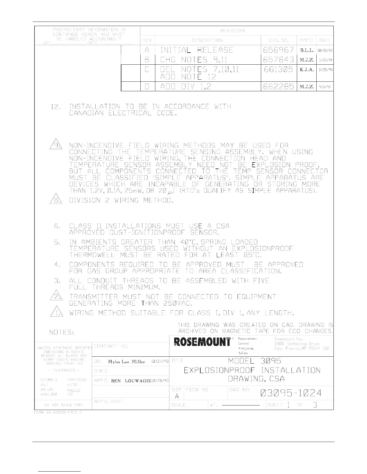 FIGURE 3-3. Model 3095 Multivariable Level Controller Explosion-Proof Installation Drawing.