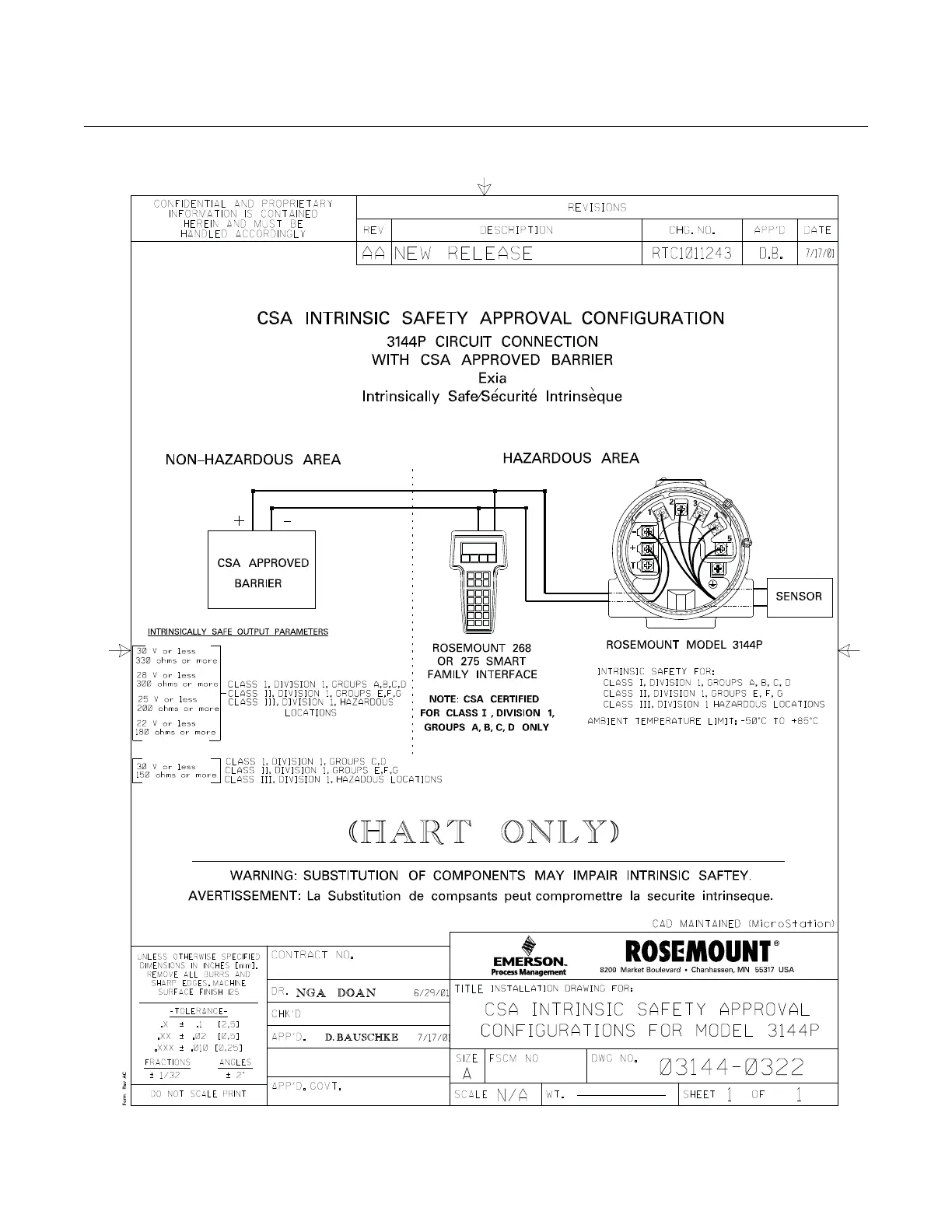 Figure B-4. 3144P (HART) CSA Intrinsic Safety Approval Installation Drawing 03144-0322. Sheet 1 of 1.