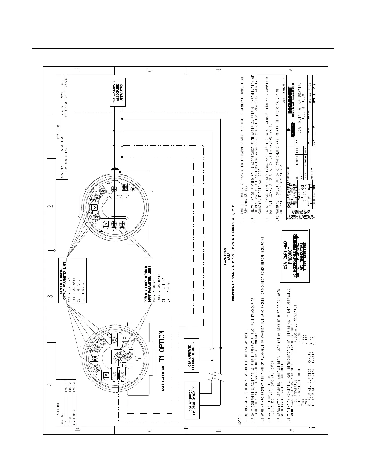 Figure B-7. 3144P (Fieldbus) CSA Intrinsically Safe Approval Installation Drawing 03144-5076. Sheet 1 of 3.