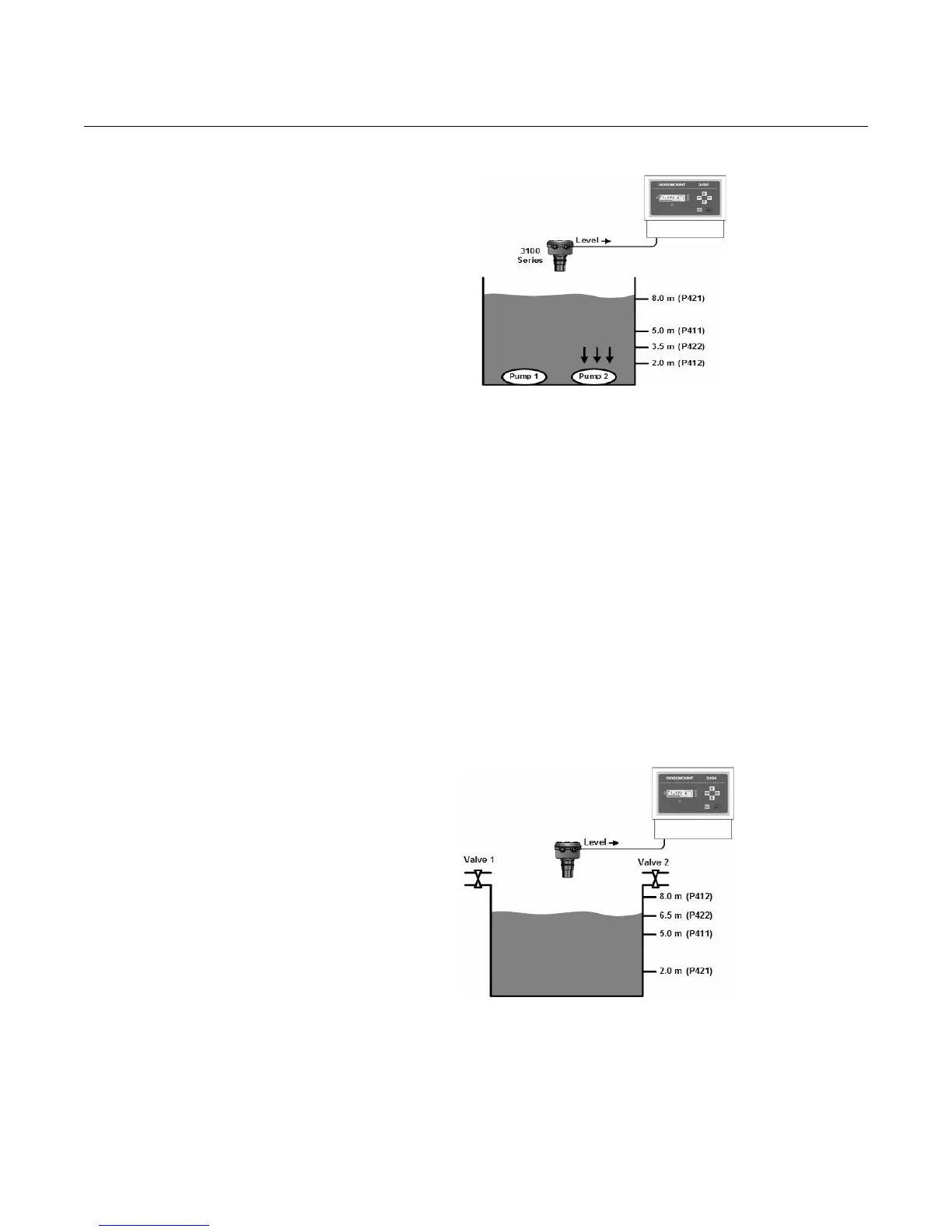 When the measured level falls below 2 metres (P412, Off point), relay RL1 will