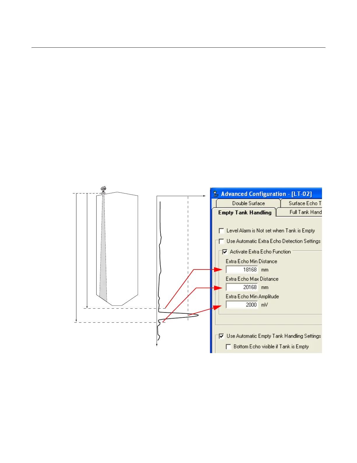 exceeds the tank bottom. The suitable values for Extra Echo Min Distance,