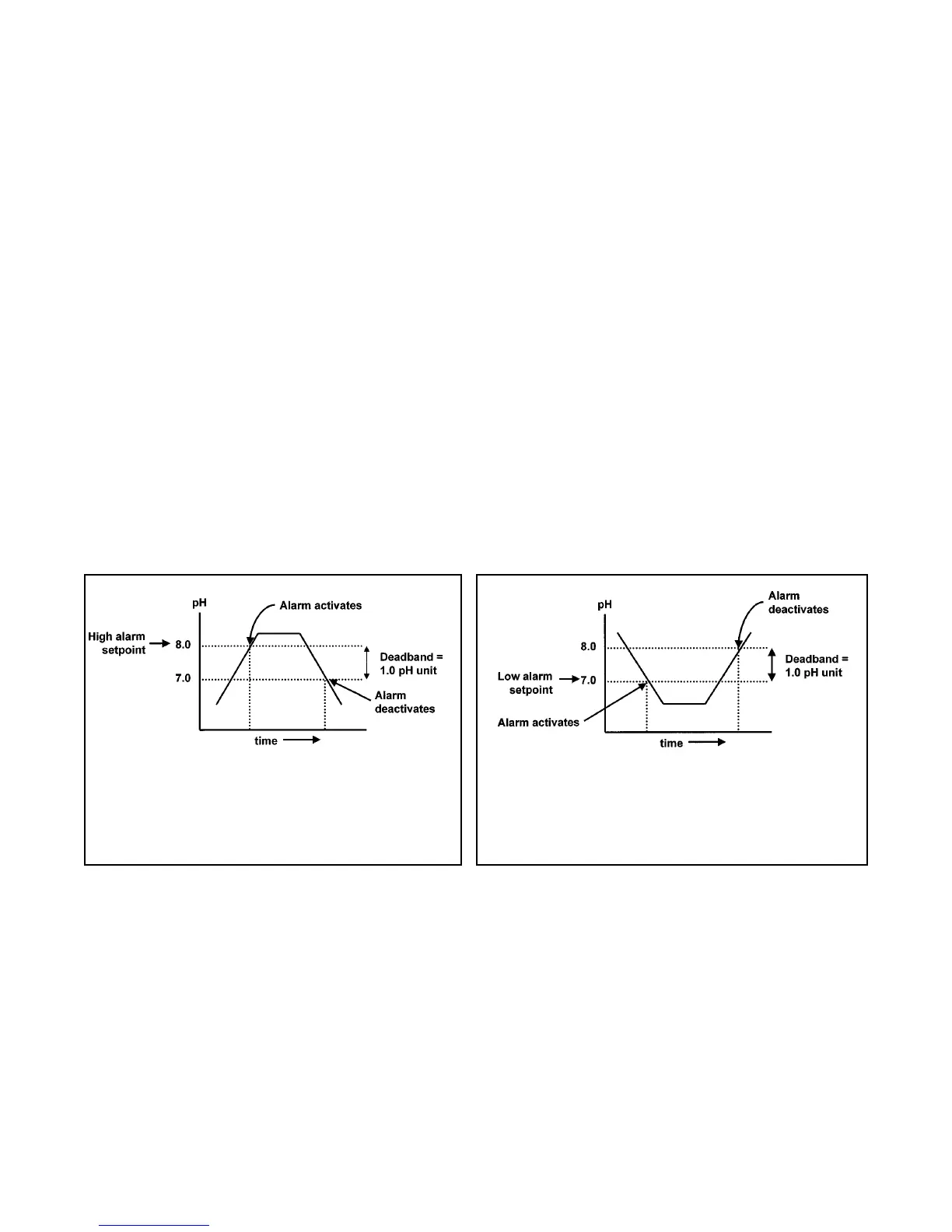 The alarm activates when the pH exceeds the high