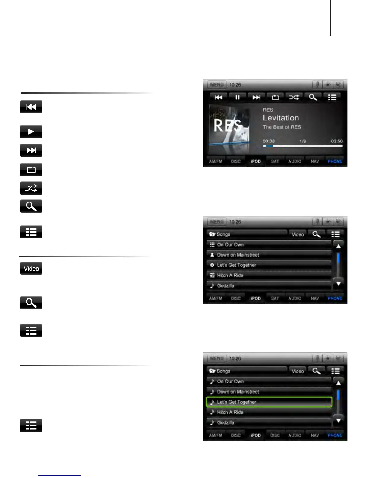 You can access music les on your iPod by using your Apple iPod cable to connect