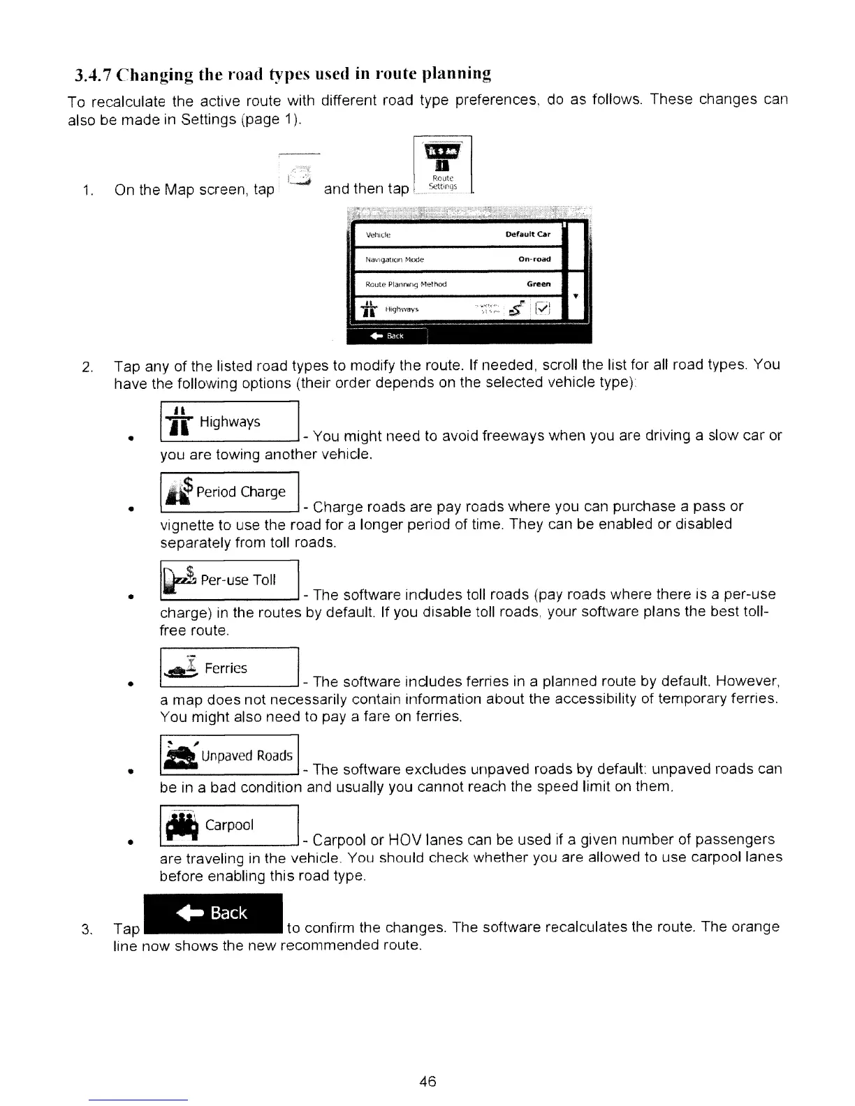 To recalculate the active route with different road type preferences, do as follows. These changes can