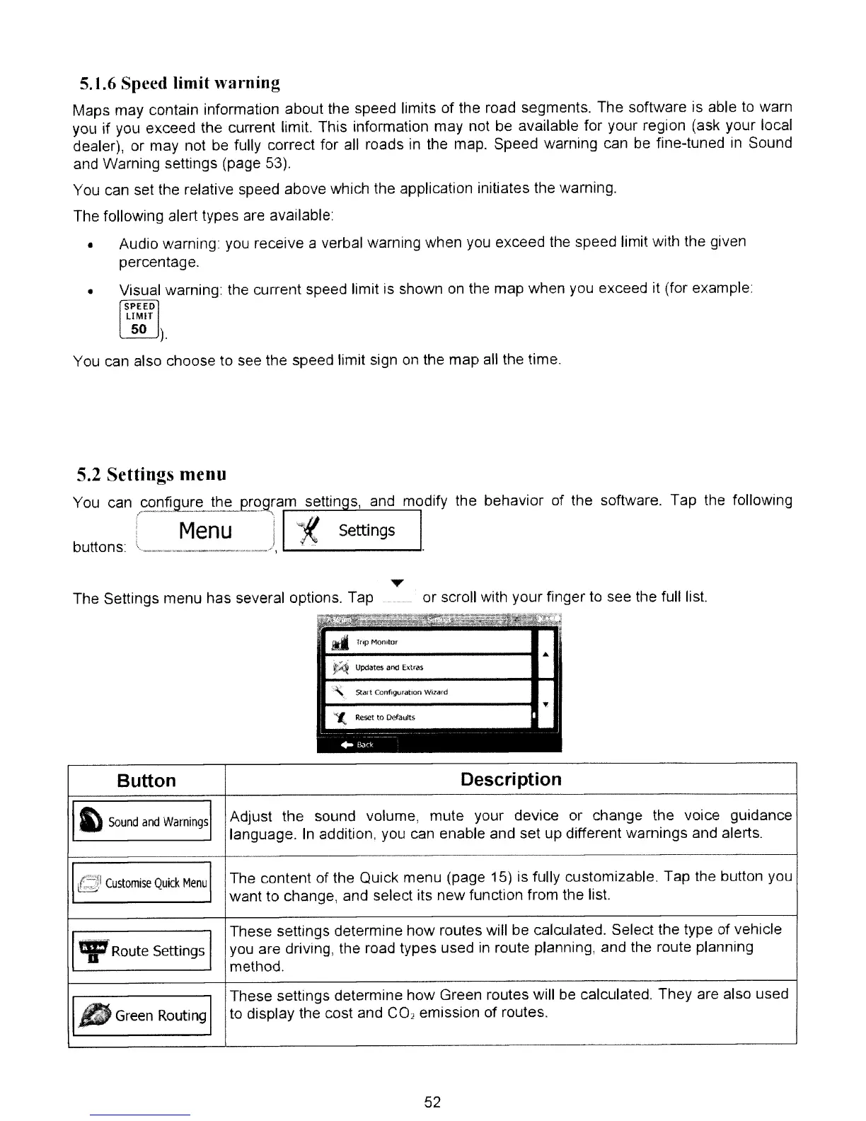 5.2 Settings menu