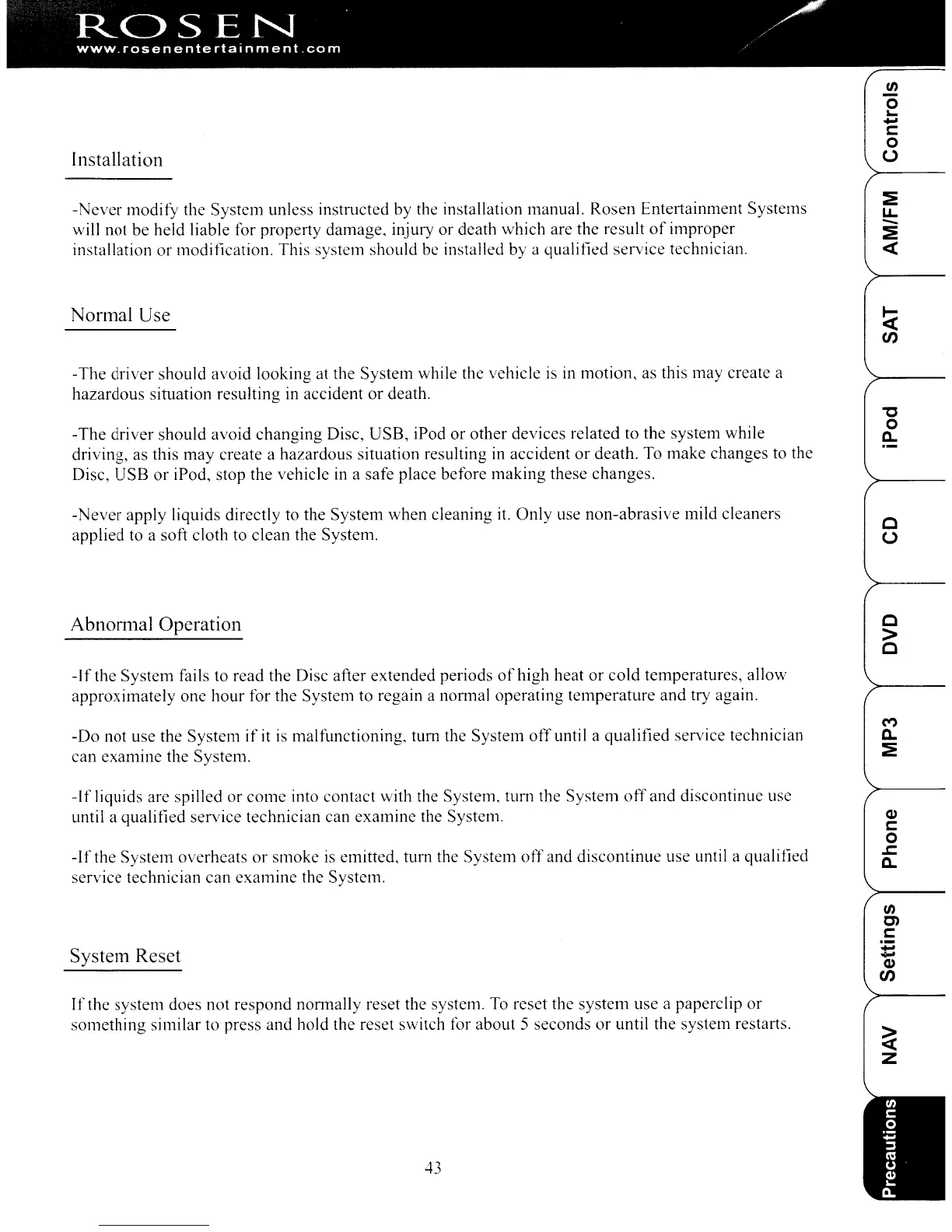 the System unless instructed by the installation manual. Rosen Entertainment Systems