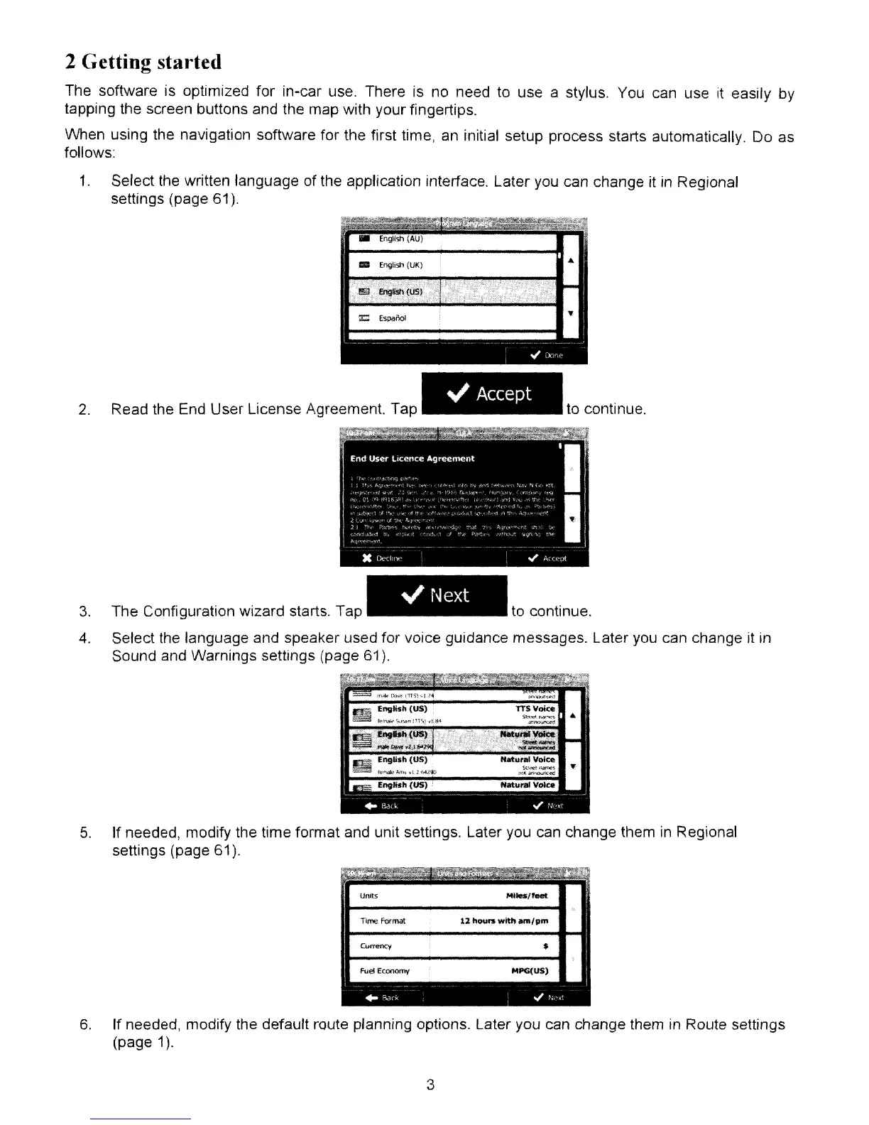 When using the navigation software for the first time, an initial setup process starts automatically. Do as