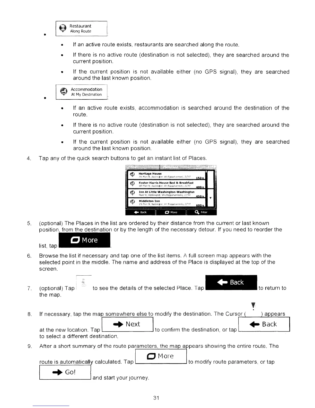 • If there is no active route (destination is not selected), they are searched around the