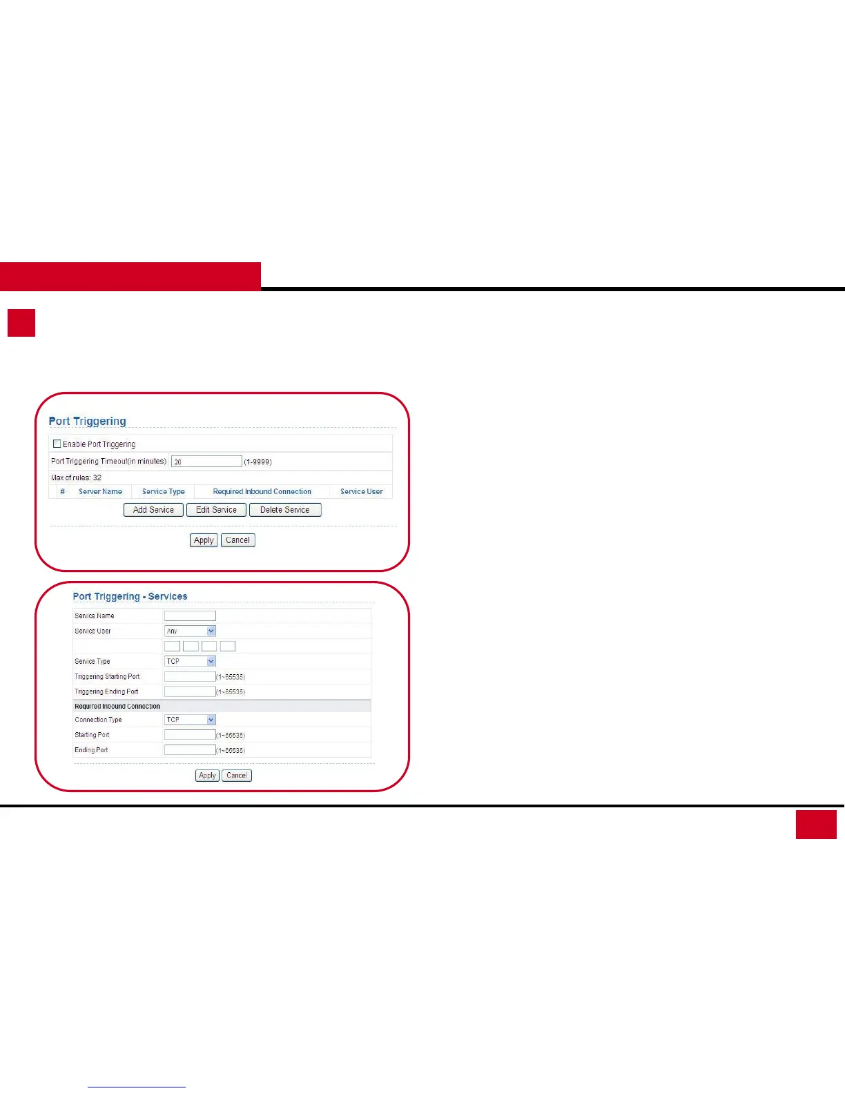 • Service List: Display the table of configured for Port Triggering