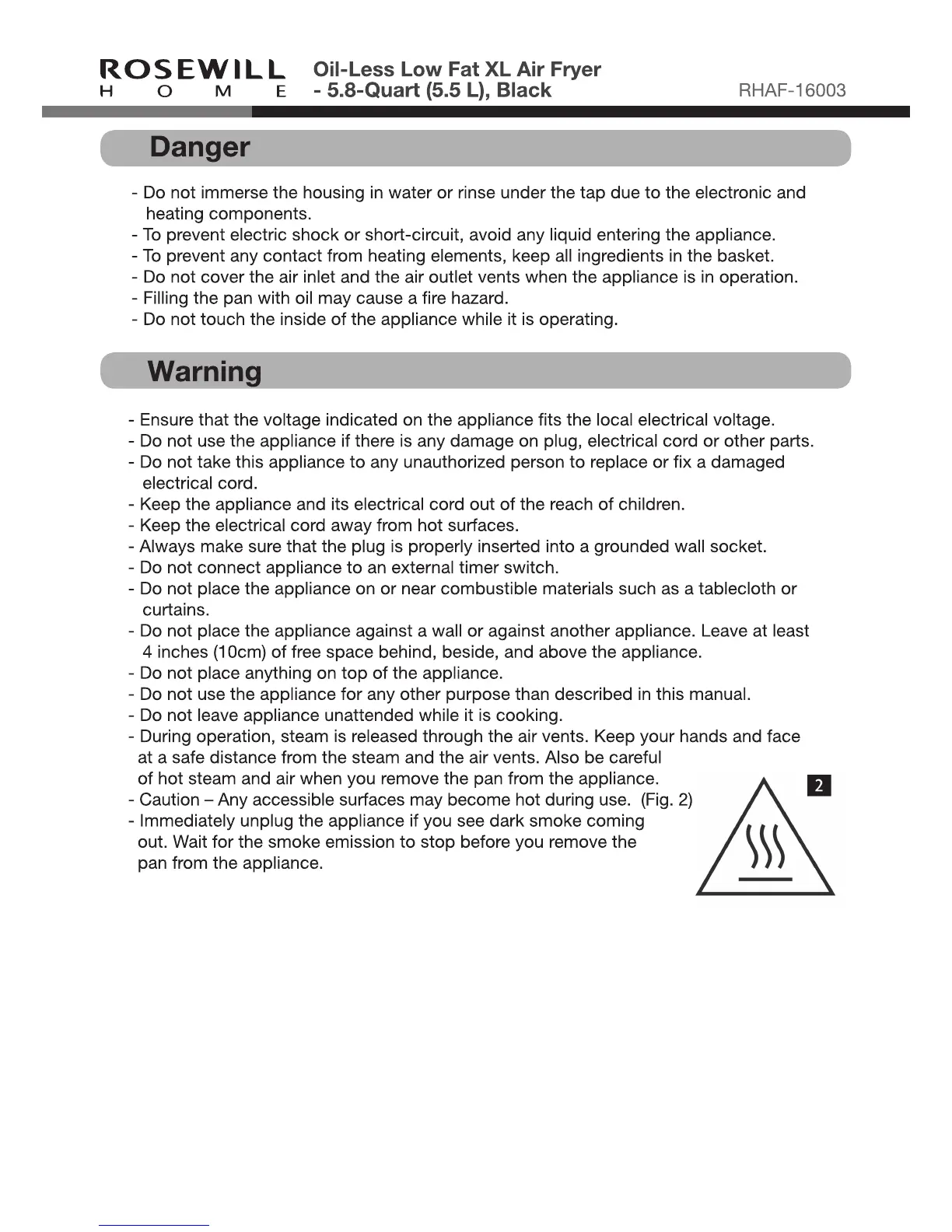 Rosewill RHAF-16003 - Danger; Safety Precautions; Warning; Operational Warnings