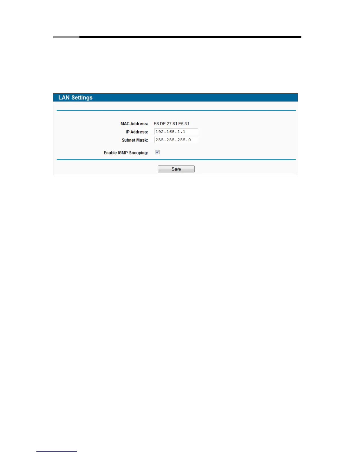 Choose menu “Network → LAN”, you can configure the IP parameters of the LAN on the screen