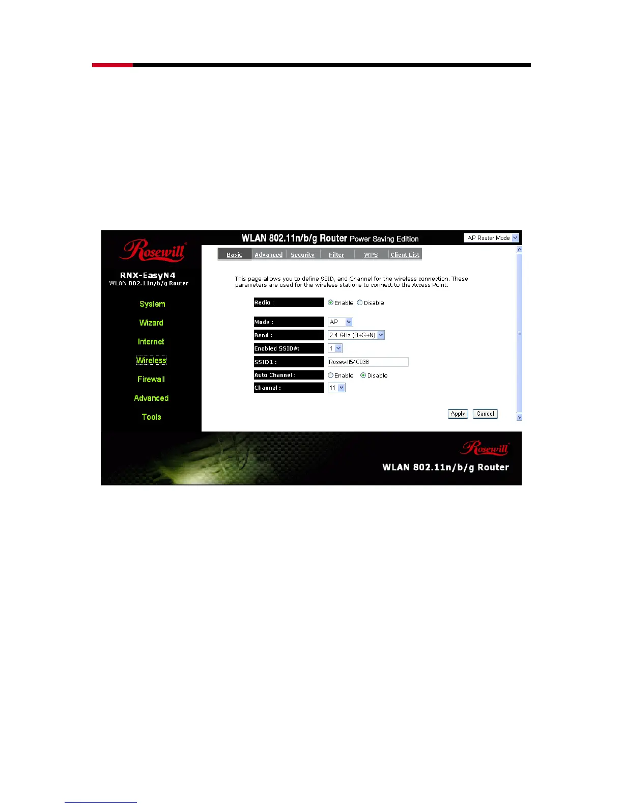 In basic setting page, you can set wireless Radio, Mode, Band, SSID, and