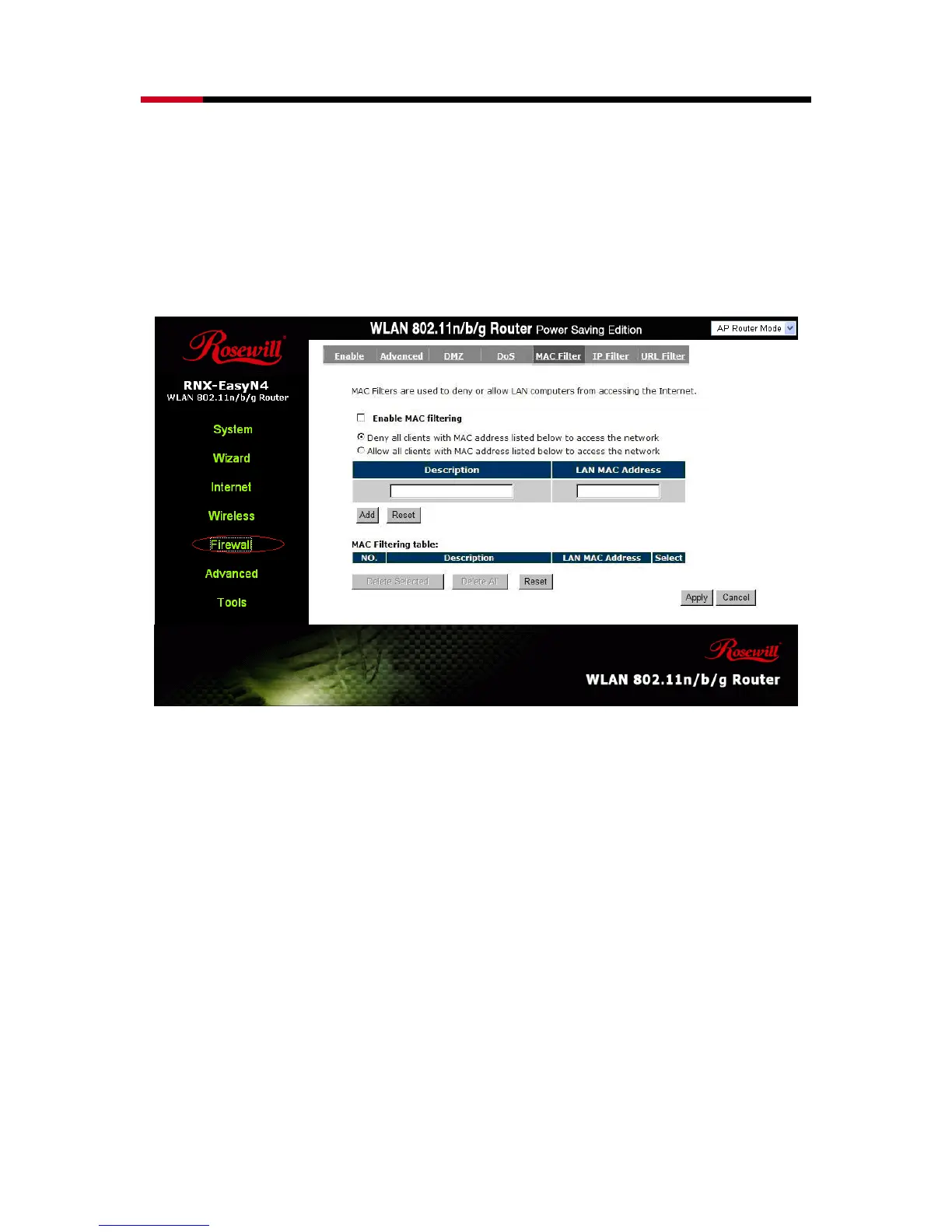 Enable MAC Filtering: Check to enable or disable MAC Filtering.