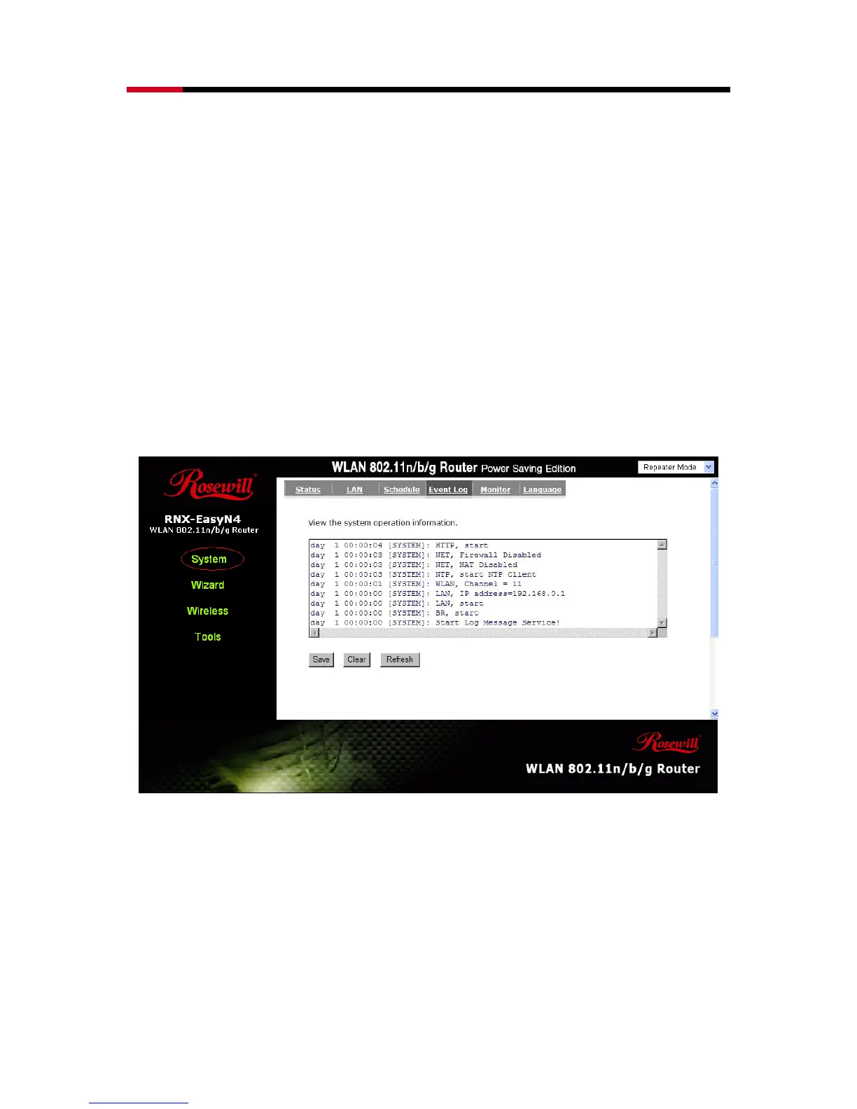 View operation log of RNX-EASYN4. This page shows the current system log of