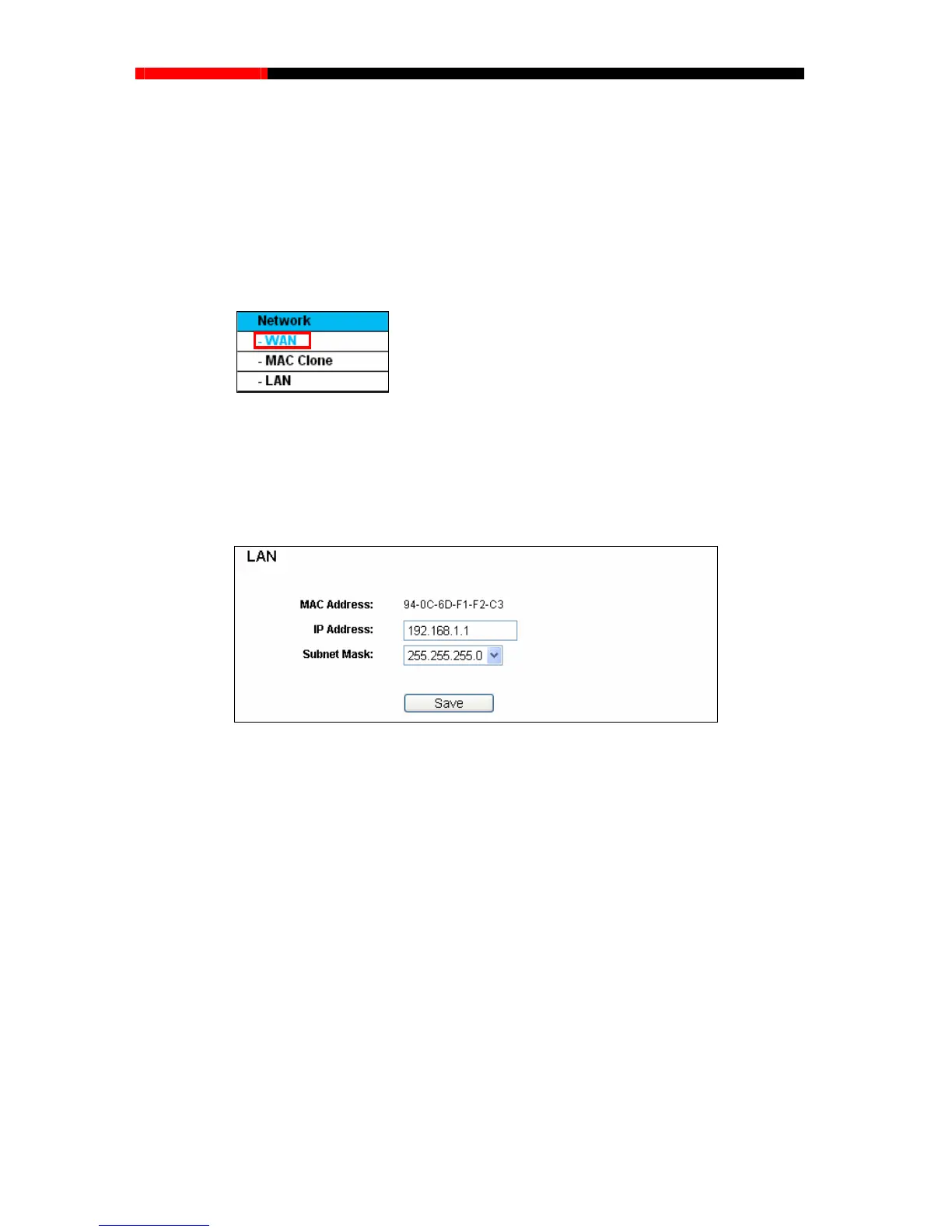 There are three submenus under the Network menu (shown in Figure 4-7): LAN, WA