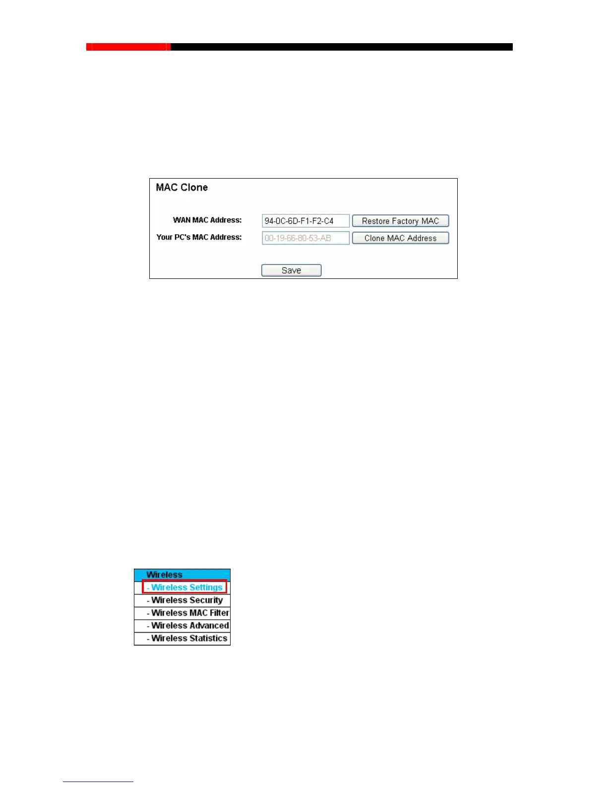 Choose menu “Network→MAC Clone”, you can configure the MAC address of the WAN on the