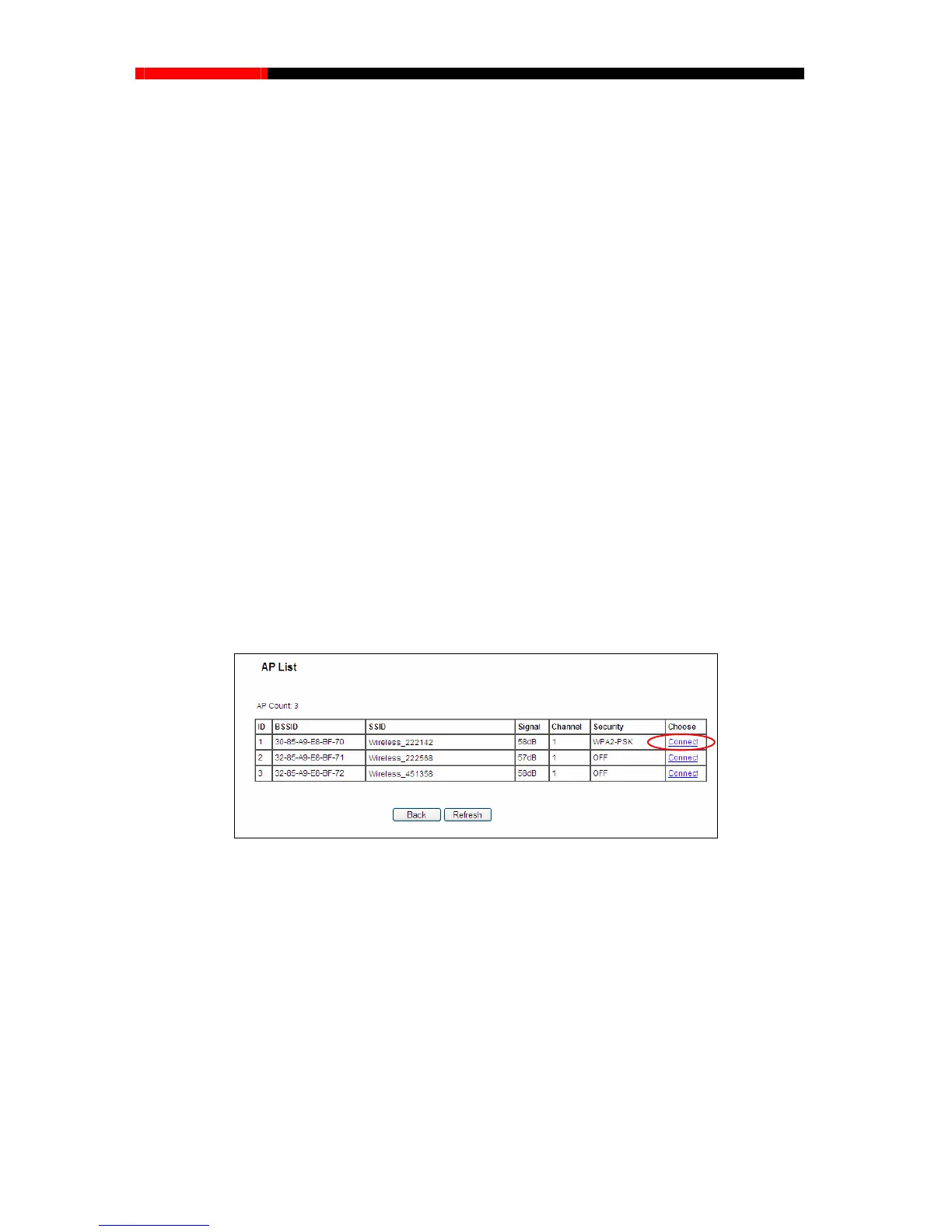Click Survey button on the Wireless page shown as Figure 4-18, and then AP List page will
