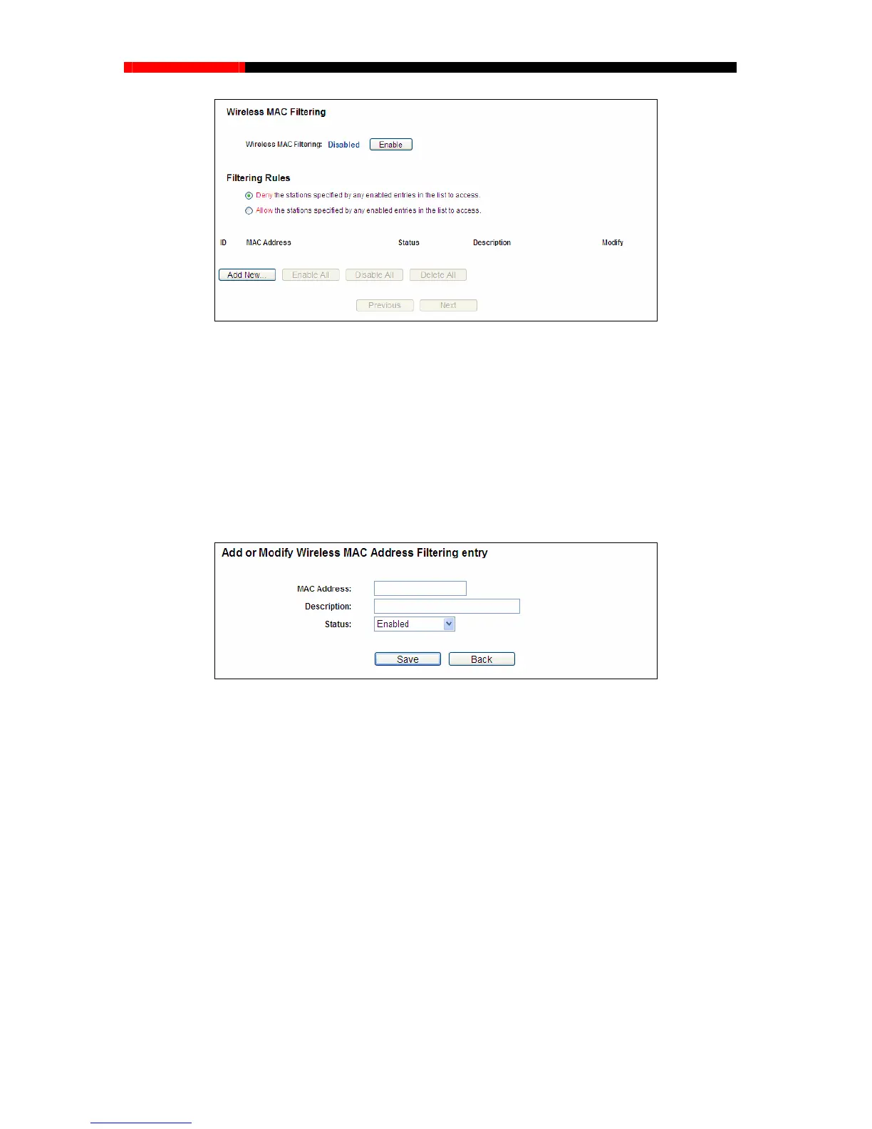To Add a Wireless MAC Address filtering entry, click the Add New…