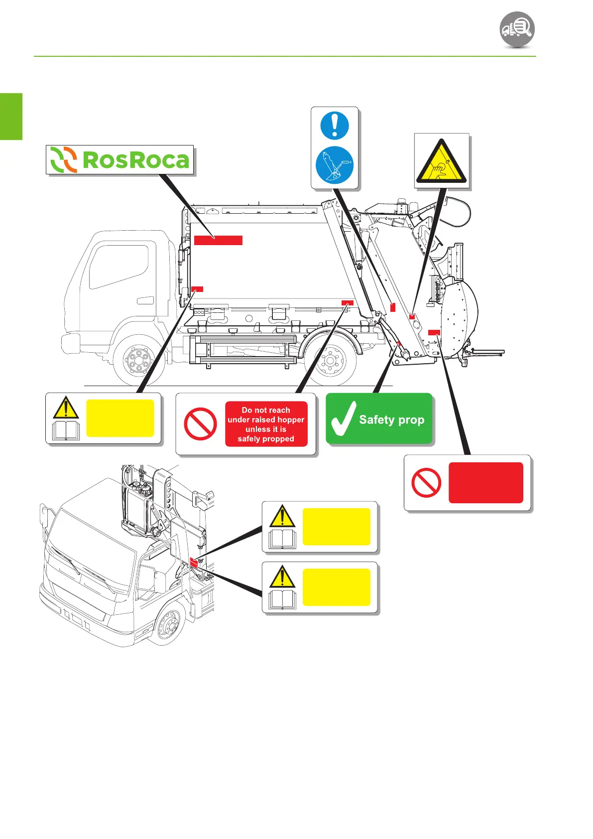 Fig. 3-3 Warning labels; left-hand side rear of refuse collection bodywork