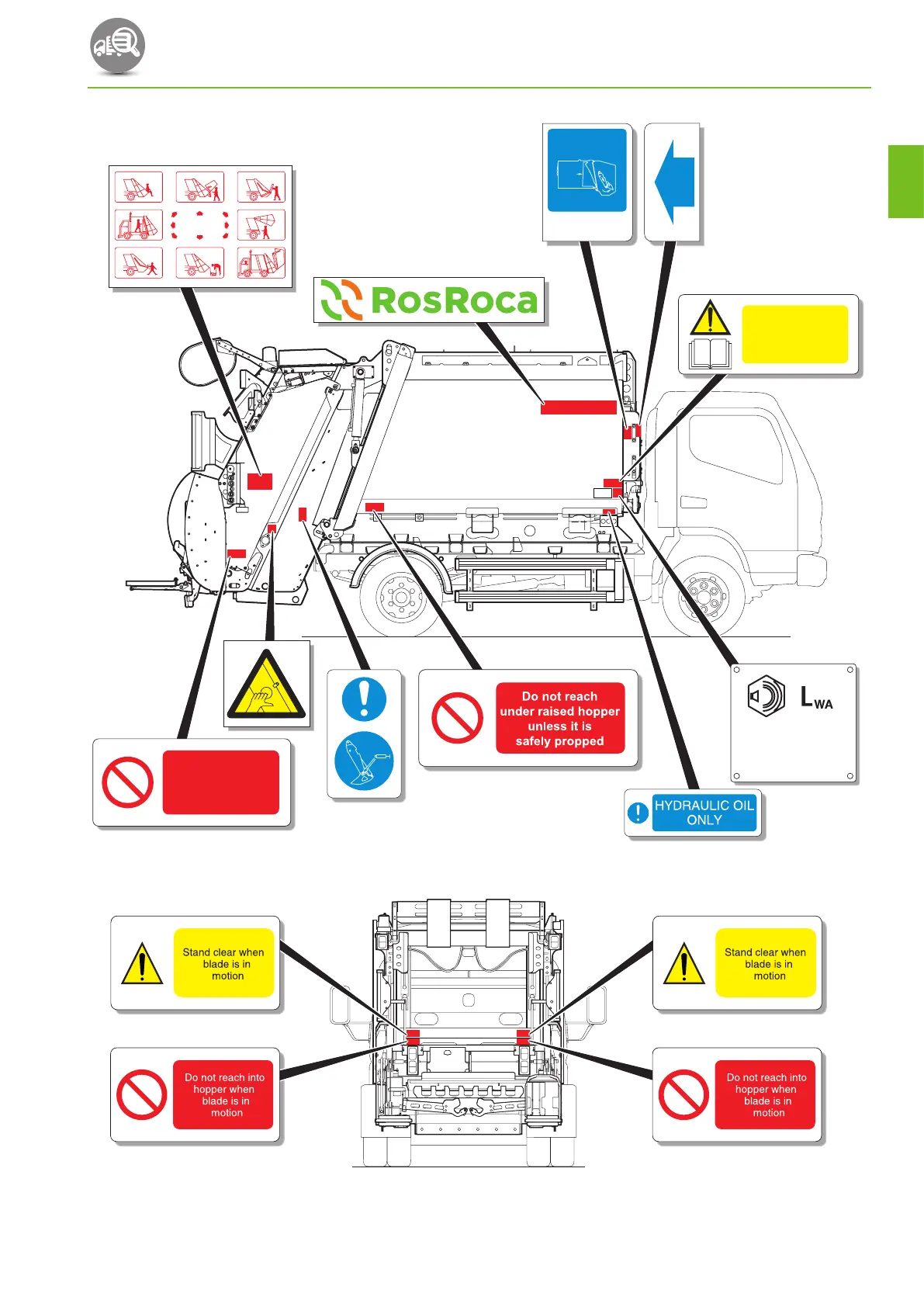 Fig. 3-5 Warning labels; rear of refuse collection bodywork