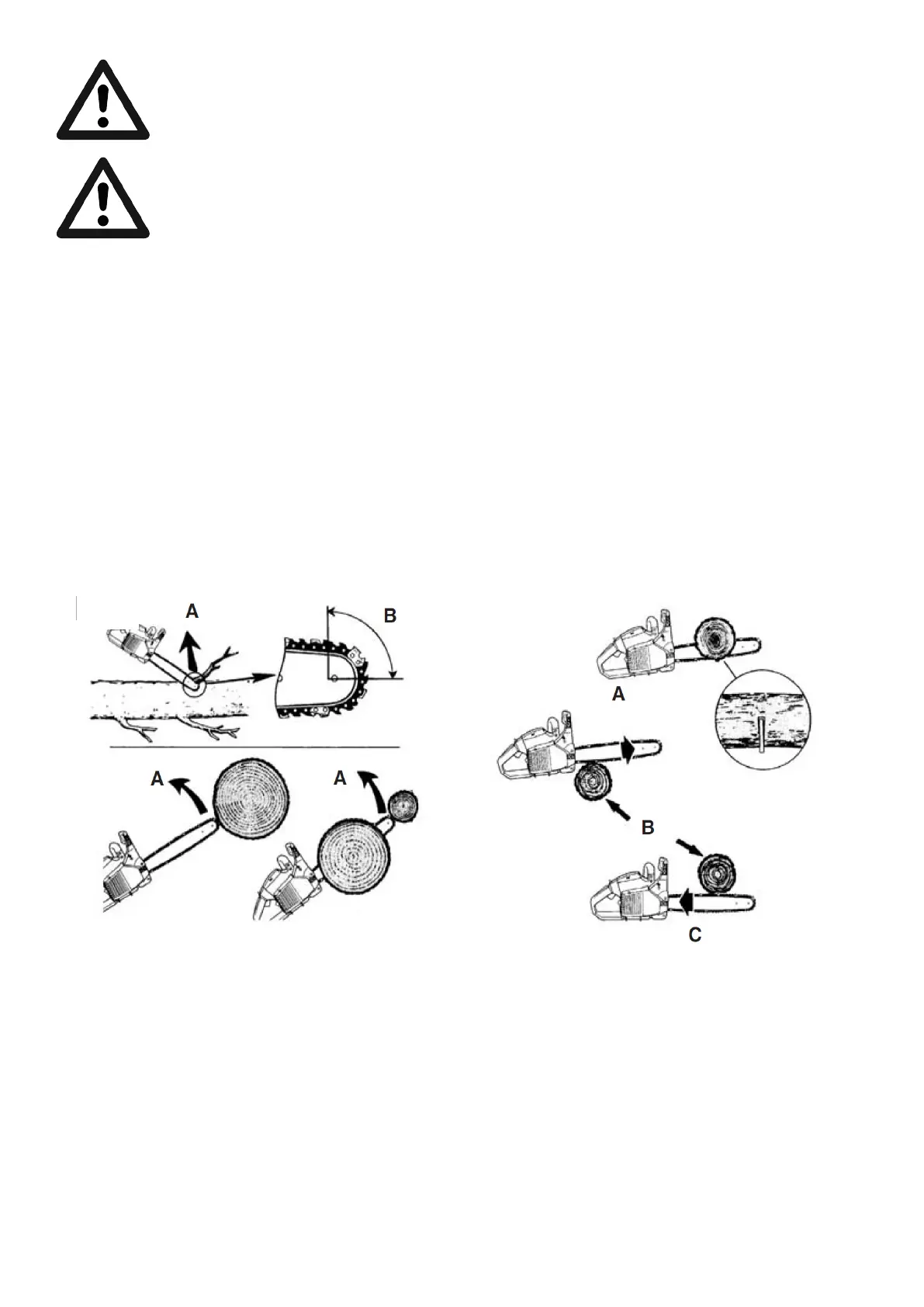 Always be alert. Rotational kickback and pinch-kickback are major chain saw opera-